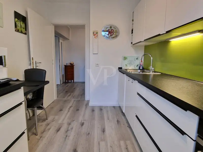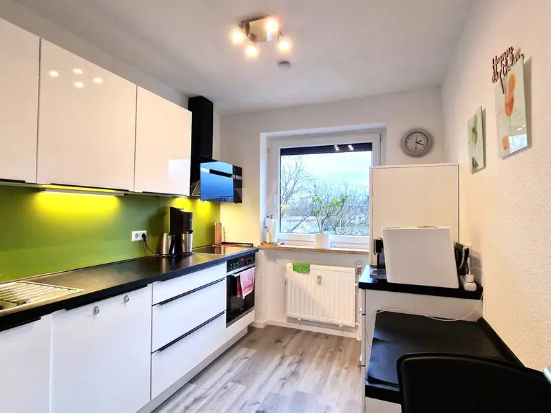 The apartment impresses with its modern living ambience, which is underlined by the attractive floor coverings, among other things. The vinyl parquet flooring, which is as good as new and impresses with its durability, is laid in all rooms and harmonizes in colour with the white interior doors, some of which have glass inserts. The tiles in the newly fitted bathroom and the kitchen with its white fronts and black worktop fit perfectly into the uniform and transparent furnishing style.
