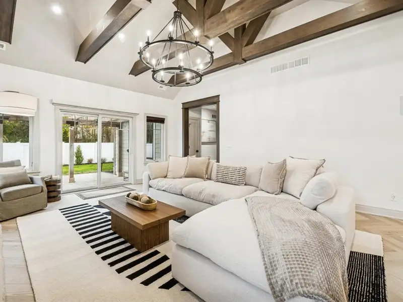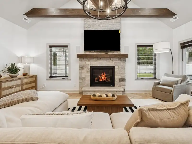 - Vaulted beamed ceiling and stone fireplace