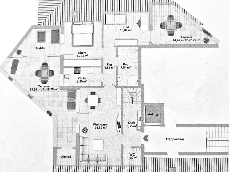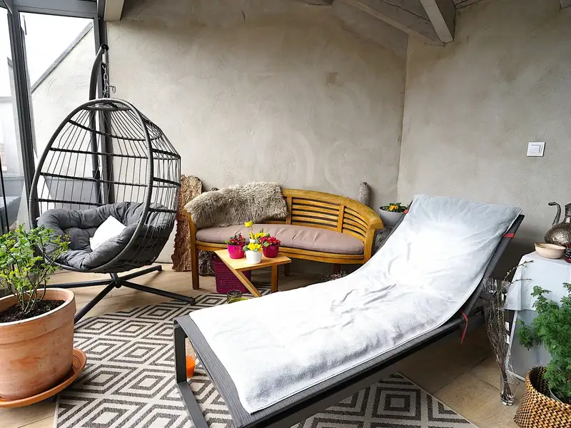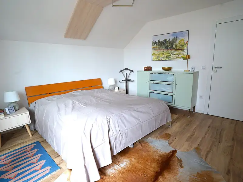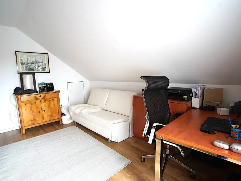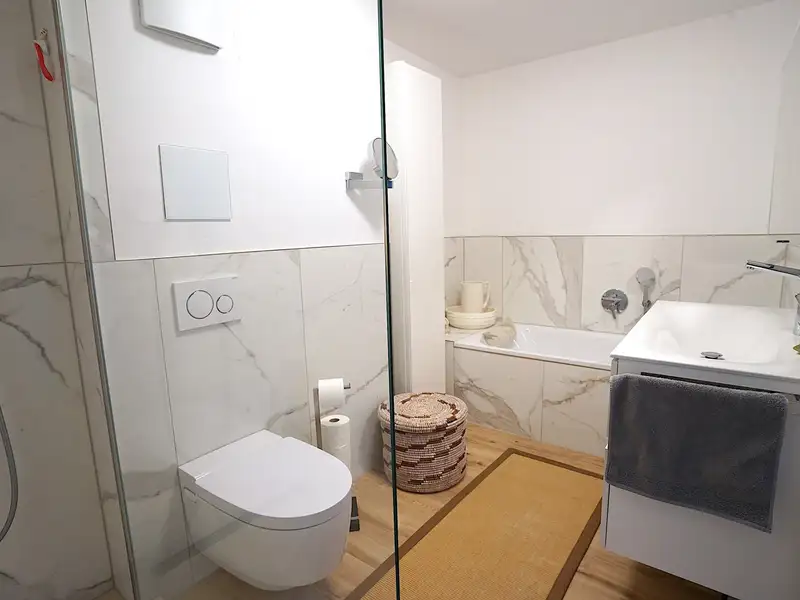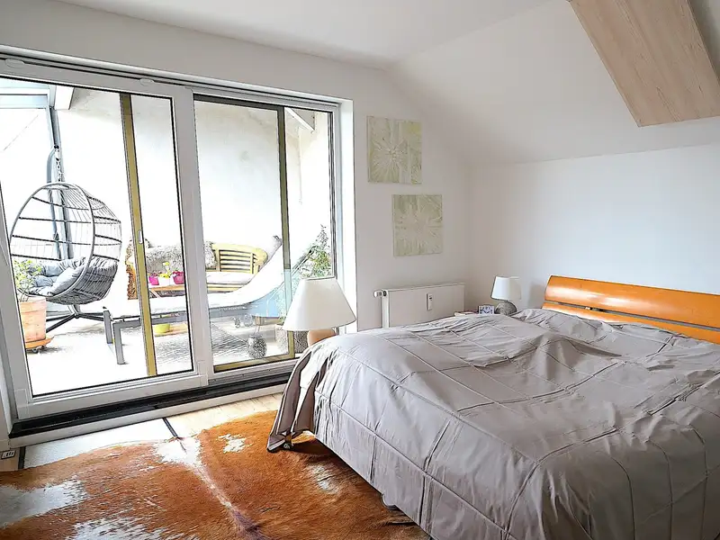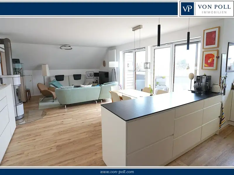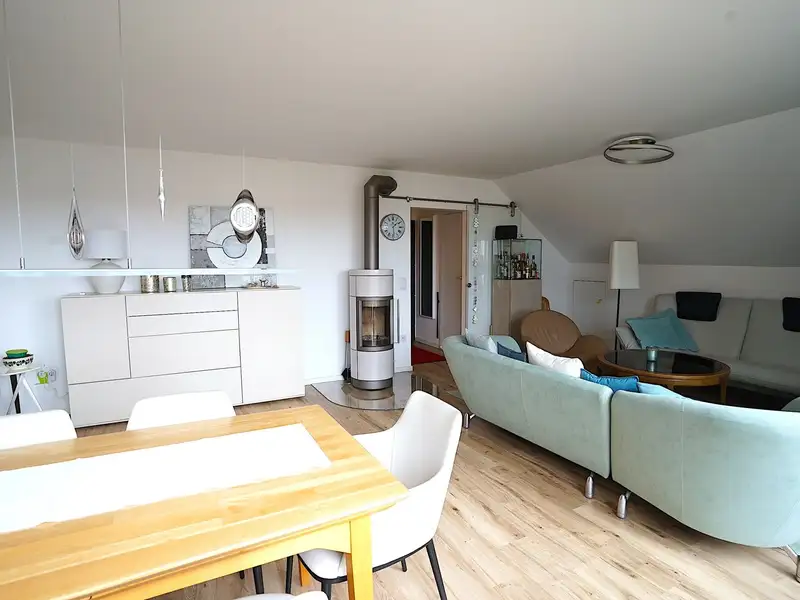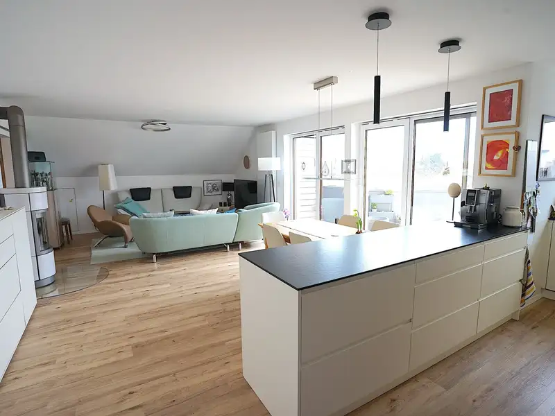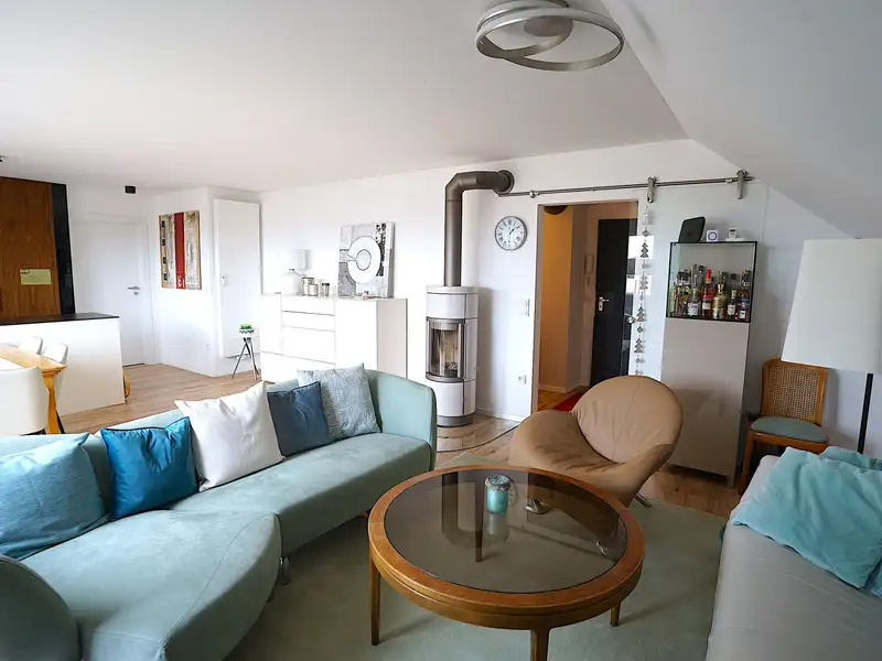 The fittings, with underfloor heating, high-quality oak floors, bathroom furniture, towel radiator, modern tiles, wood-burning stove, several awnings and elegant kitchen, leave nothing to be desired. The highlight is certainly the large, secluded roof terrace facing west, where you can enjoy the sun and the view. The owner would like to remain in the apartment as a tenant for a certain period of time, so that you can calculate with a secure rental income of approx. € 1,700 per month for the first few years. We will be happy to provide you with further information in person.