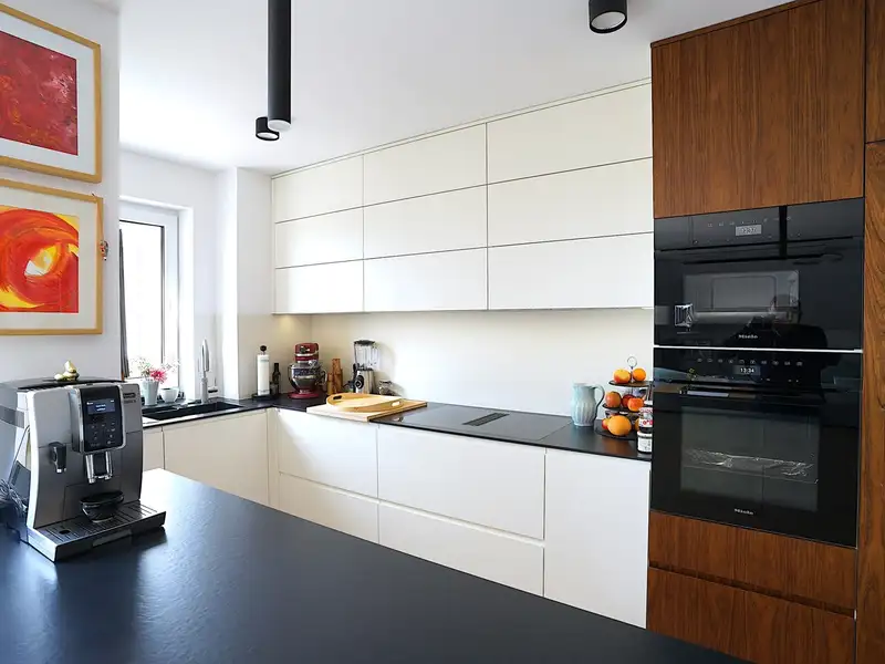 The elegant and modern kitchen is offered as an option for € 40,000 and the underground parking space can be purchased for € 19,000. The practical and high-quality built-in cupboards, the modern bathroom furniture, the wood-burning stove, the interior blinds, the built-in cupboards on the roof terrace and the electric awnings, with a total new price of around € 34,000, are already included in the purchase price.