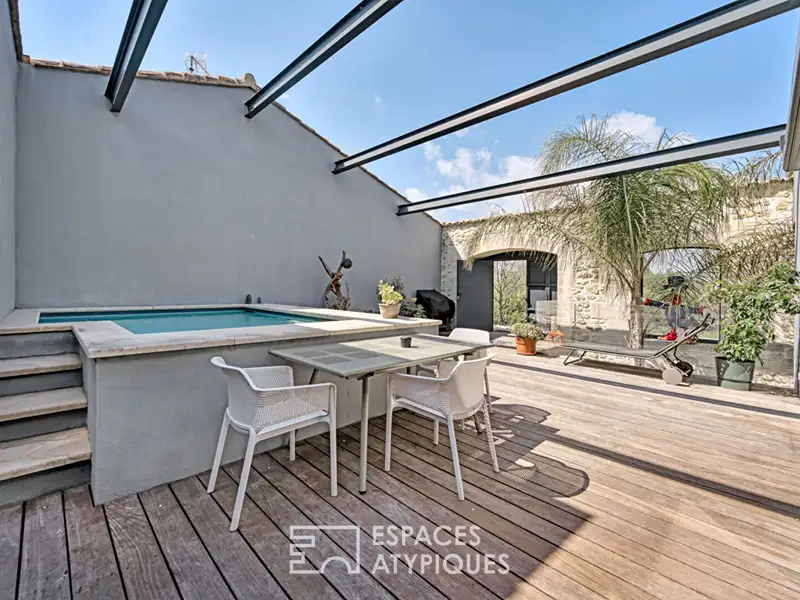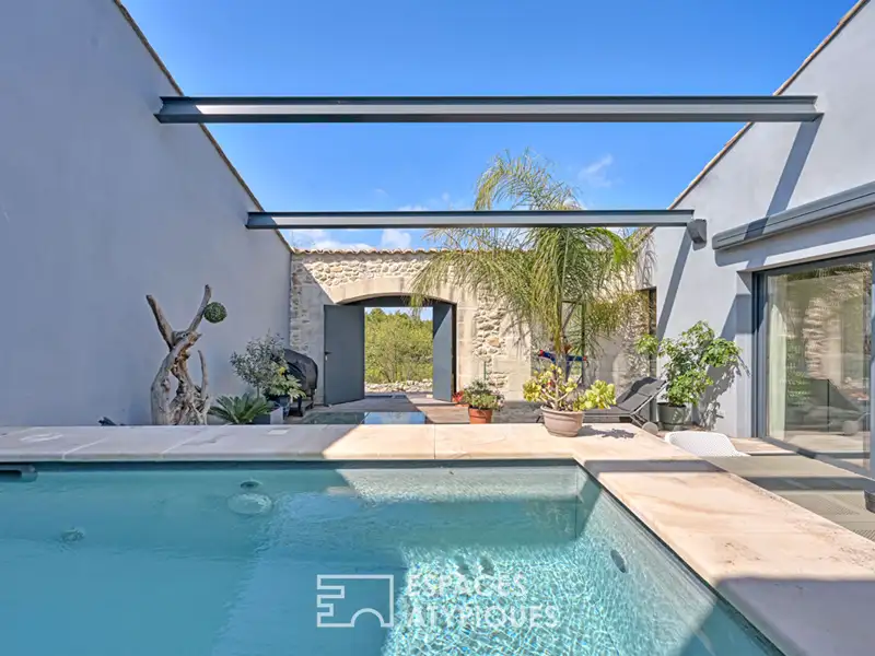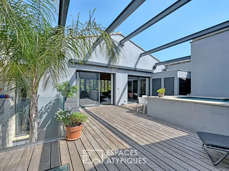 The exteriors elegantly extend the interior spaces. A first patio, designed as a relaxation area, houses a swimming pool-jacuzzi, ideal for convivial moments.
