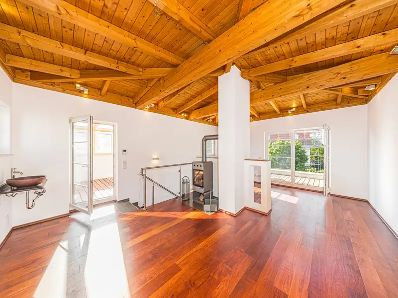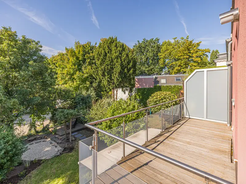 On the first floor, the detached town villa impresses with an open-plan living and dining area as well as a fireplace, which provides cozy warmth in the cooler seasons. The modern fitted kitchen is open-plan and perfectly integrated into the room, making cooking and eating together a communicative focal point. The rooms were laid with a tropical solid wood floor. Merbau wood is extremely hard-wearing and robust, making it very durable.
