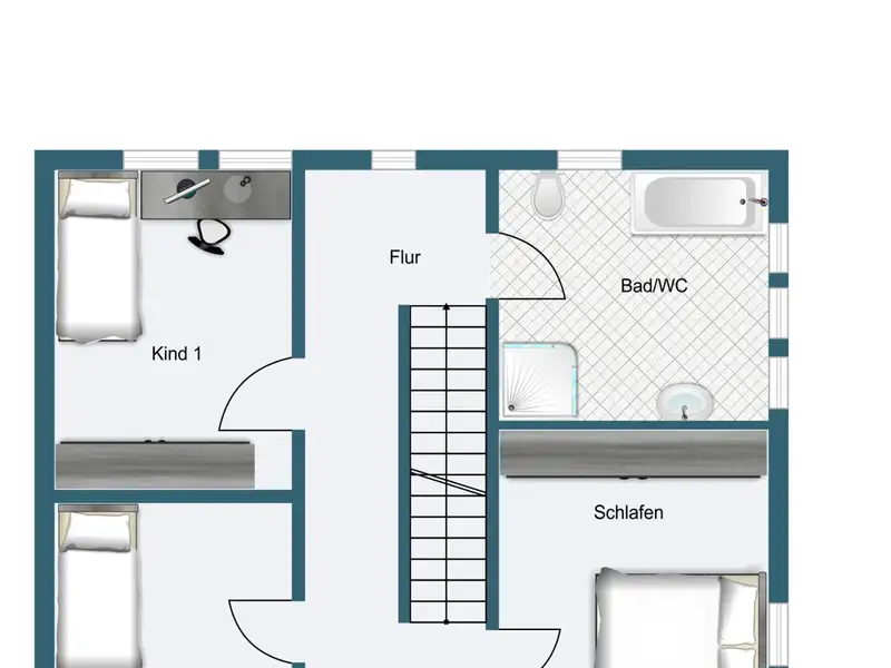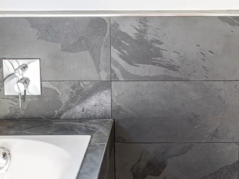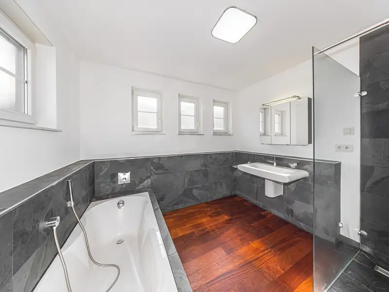 Two modern bathrooms, one of which is clad in fine natural slate, offer comfort for family and guests. The floors are fitted with underfloor heating throughout, both in the entire living area and in the fully developed basement. The cellar offers ample storage space and additional possibilities for use.