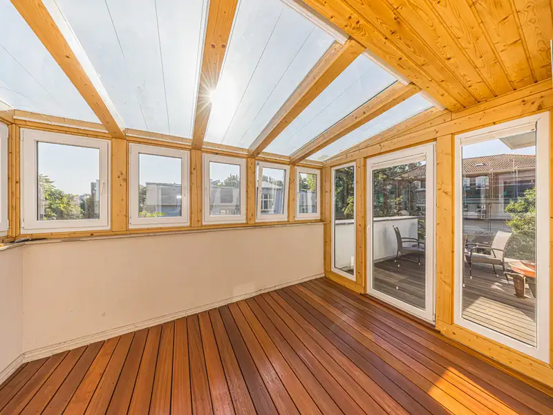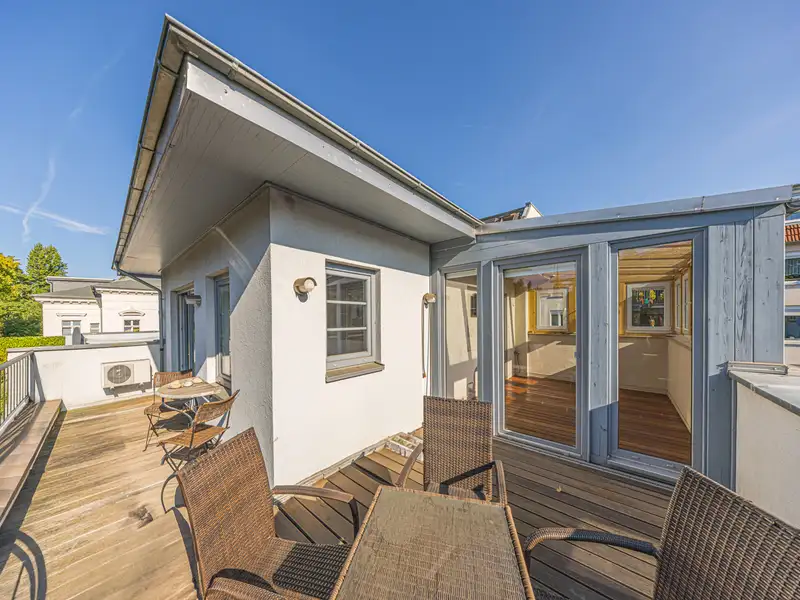 A total of seven generously proportioned rooms are available, including four possible bedrooms, some of which are equipped with custom-made built-in wardrobes. The attic is air-conditioned and is suitable as a studio, additional bedroom or work area. An additional fireplace in the studio contributes to a cozy ambience. Another highlight is the adjoining conservatory, which has been fitted with new bankirai wood flooring and offers a sheltered view of the countryside.