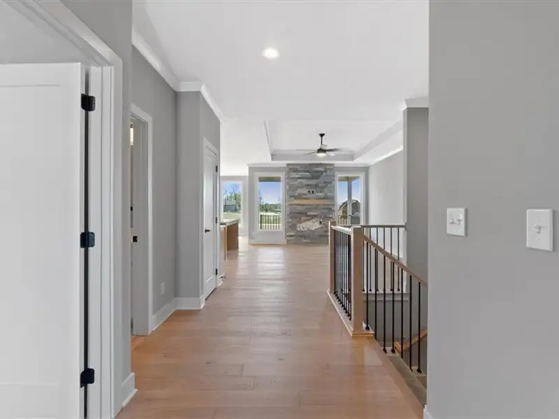 - Floor-to-ceiling stone fireplace