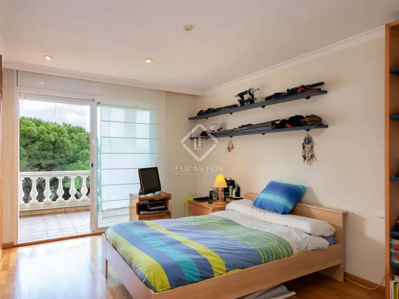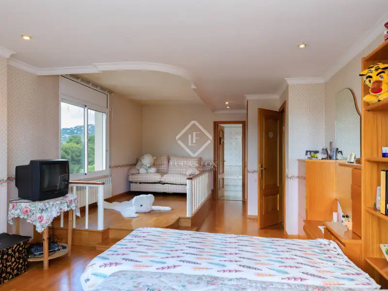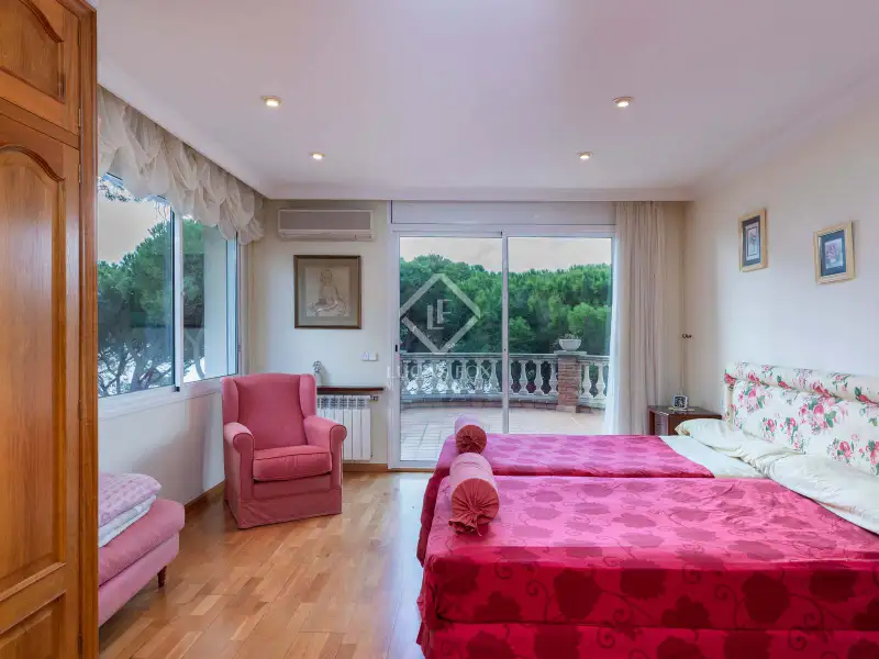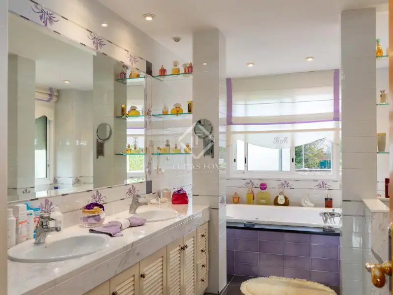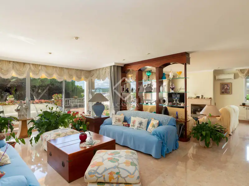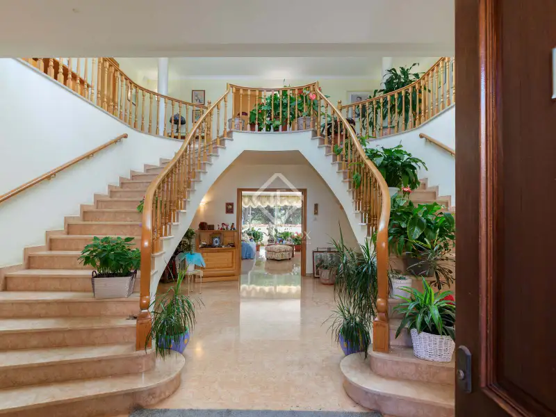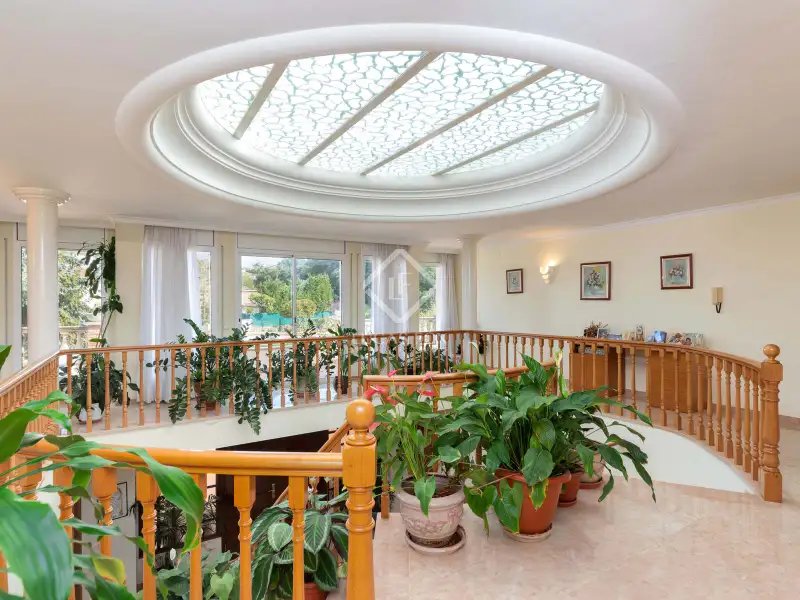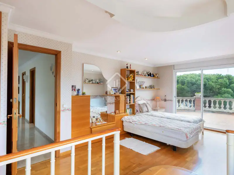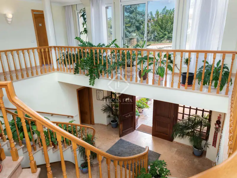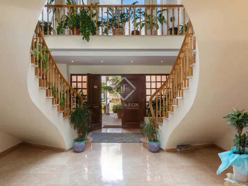 To go up to the second floor we have a majestic double staircase located on both sides of the hall. This level enjoys plenty of natural light thanks to a huge skylight and large windows that connect to the front terrace. Of the three bedrooms located on this floor, two of them have their own bathroom. The bedroom in the middle includes a semi-separate office and uses the bathroom that is located on the same floor, but not inside the bedroom. All bedrooms have direct access to the terrace, with views of the sea and the sunset.