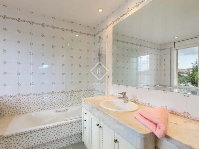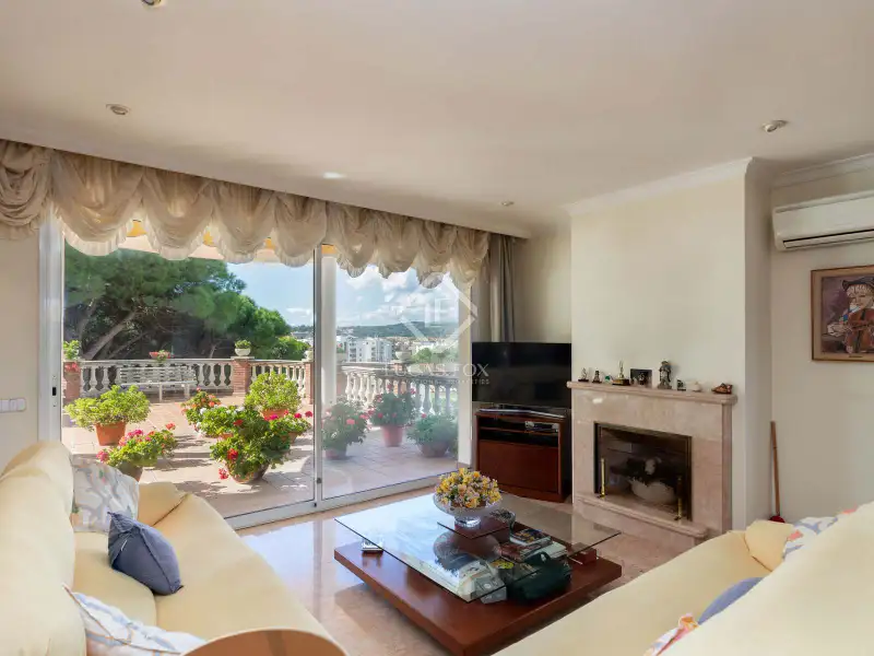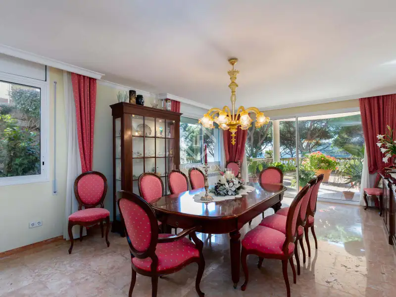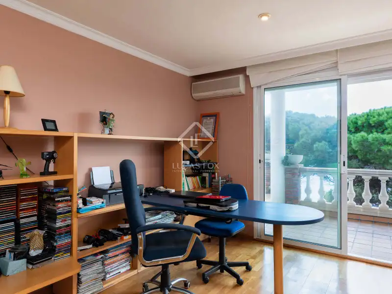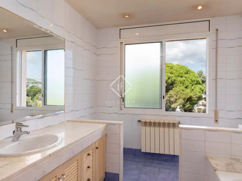 We enter the house through a well-kept garden with flowers, plants and natural grass. Once inside the house, a majestic entrance leads us to a spacious and bright double-height hall. On the ground floor we find the large living room with two rooms, with a fireplace and large windows that lead to a terrace with sea views. The dining room is separated from the living room by a door. It is very spacious, with plenty of space to accommodate diners and guests. Both the living room and the dining room have direct access to the large terrace and the garden with lawn and pine trees. Just behind the dining room is the kitchen, which in turn communicates with the lower part of the house. The main floor also houses a guest bedroom, a complete bathroom and an office.