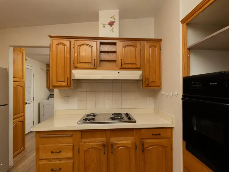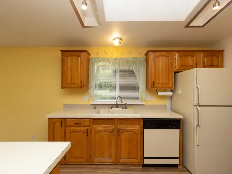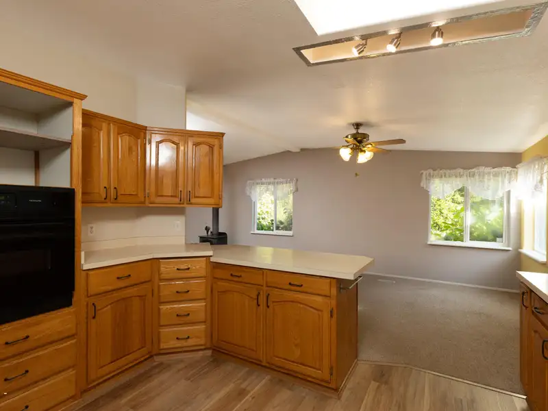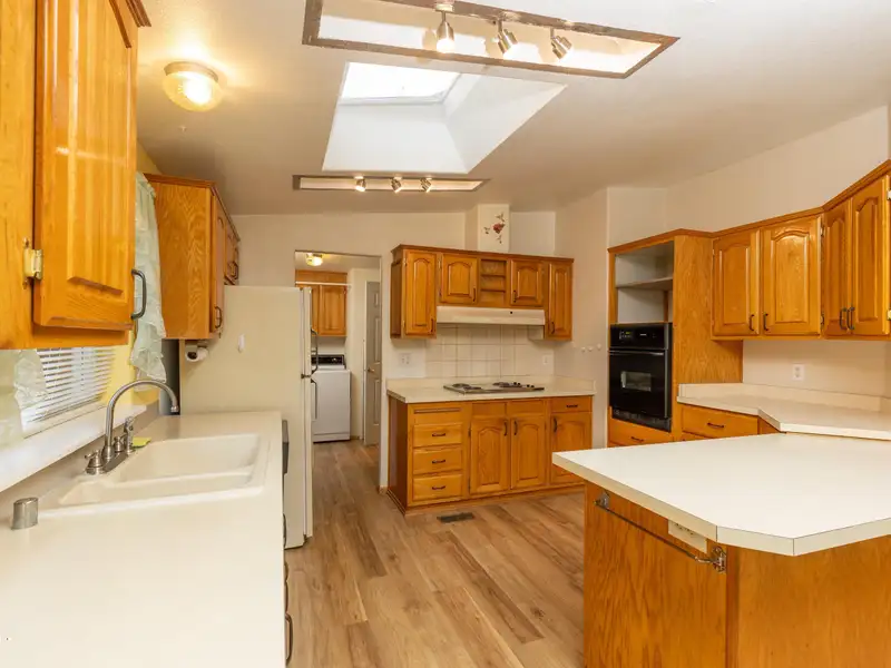 - Open kitchen with oak cabinets