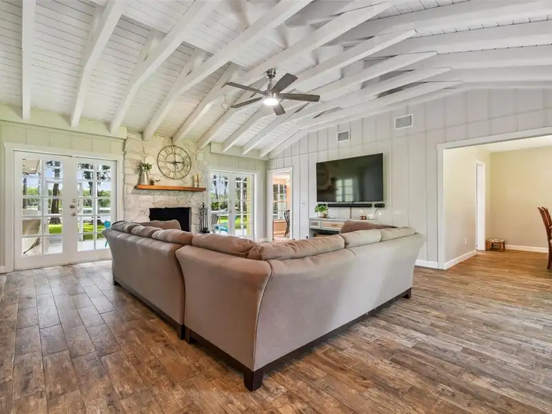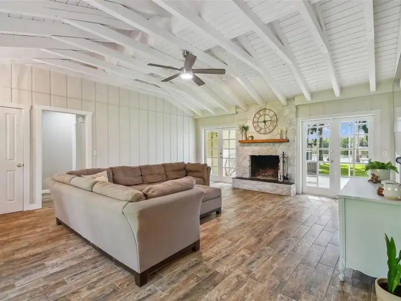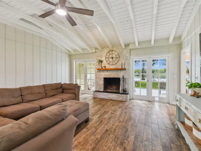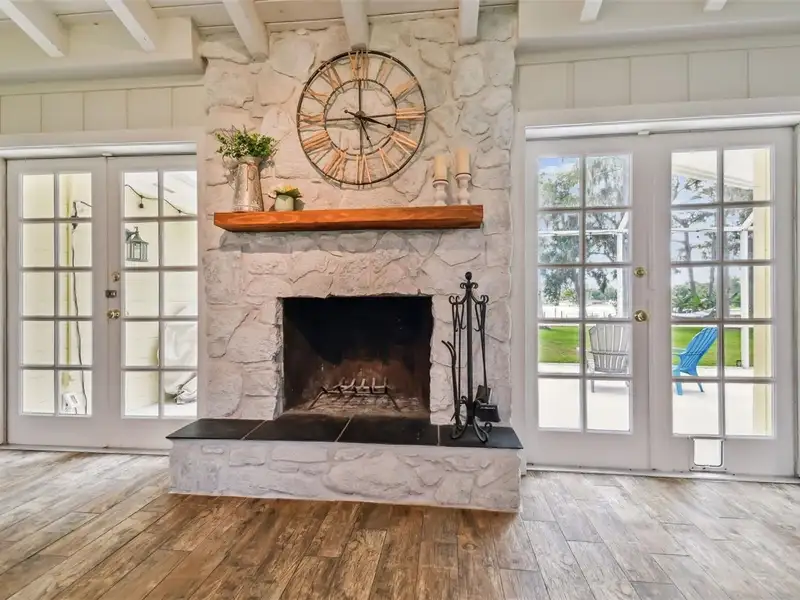 - Wood-burning fireplace with exposed beams