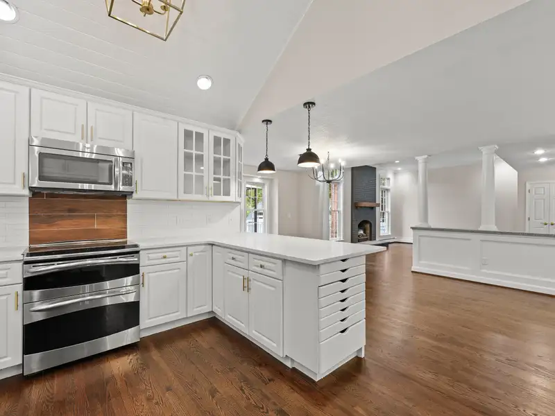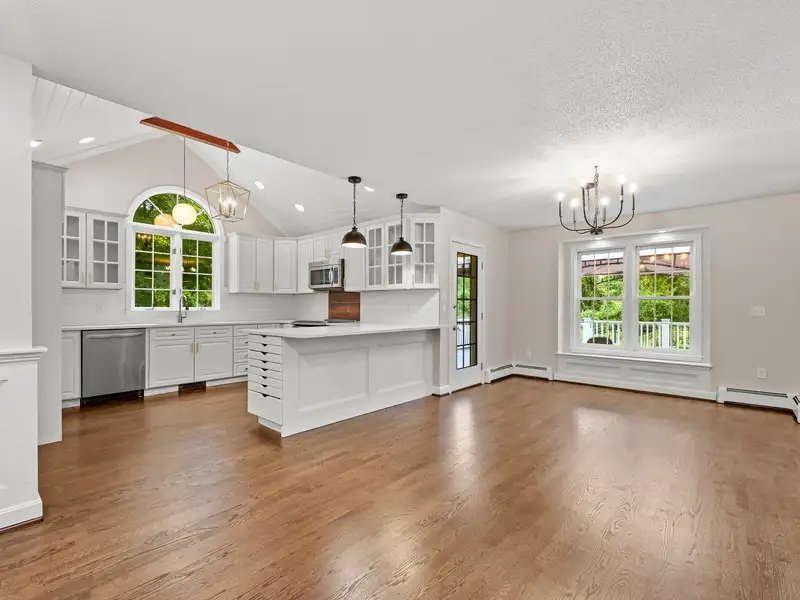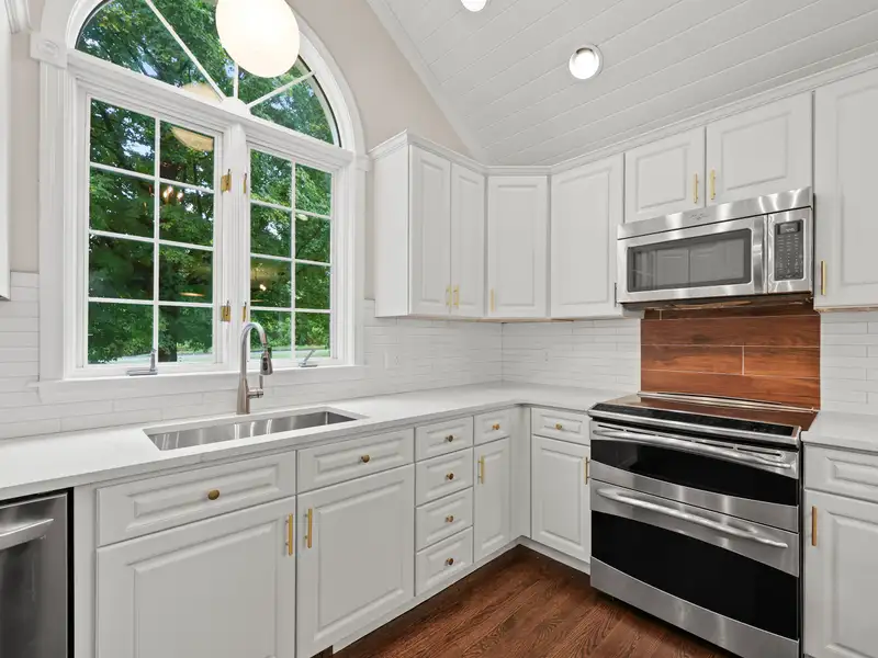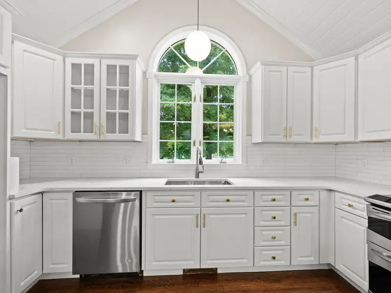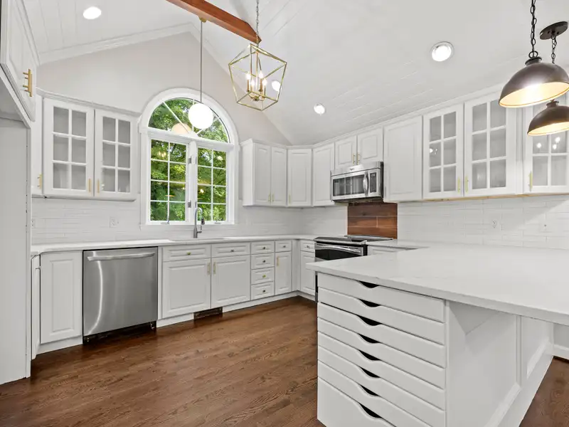 - Kitchen with vaulted ceilings and quartz counters