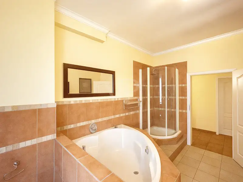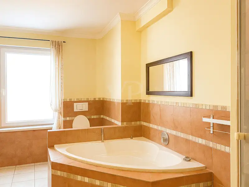 The bathroom is elegantly designed and has a bathtub, shower and contemporary sanitary facilities.