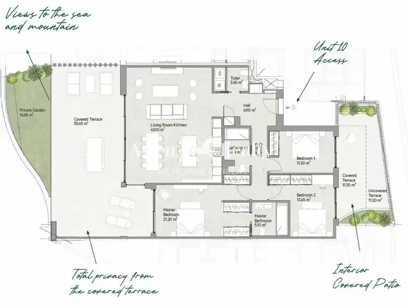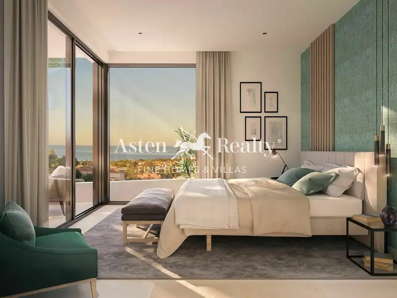 The master bedroom is en-suite with a walk-in closet, flooded with light, offering views of the sea and mountains.