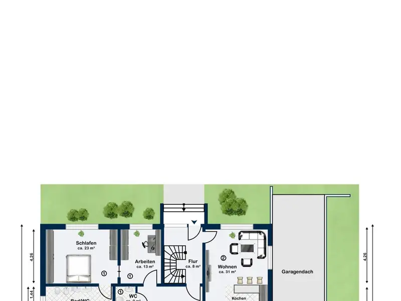 As soon as you enter the apartment, you are greeted by an inviting hallway that flows harmoniously into the open-plan dining area with access to the approx. 60 square meter south-facing terrace with garden. From here, you can access both the kitchen and the bright living area of approx. 40 square meters. The kitchen offers additional space for another dining table and direct access to a covered, secluded terrace with garden - perfect for sheltered hours outdoors.