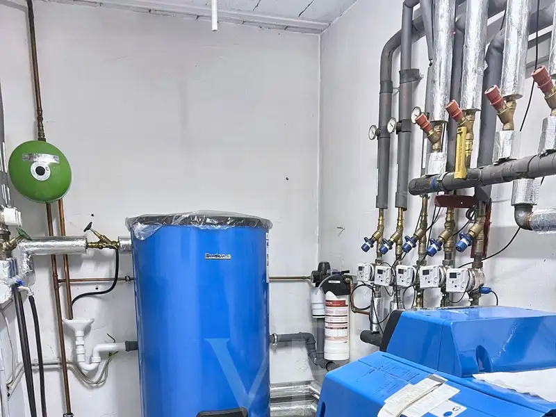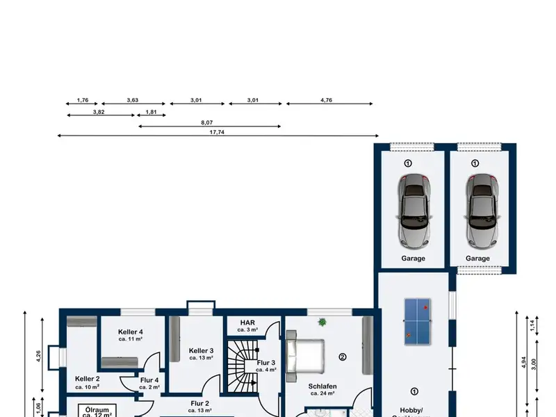 The apartment also has two separately lockable garages, one of which is extended with a hobby/equipment room, two cellar rooms and a laundry room.