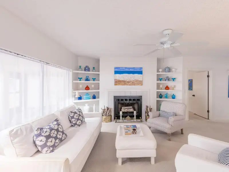 - Wood-burning fireplace in living area