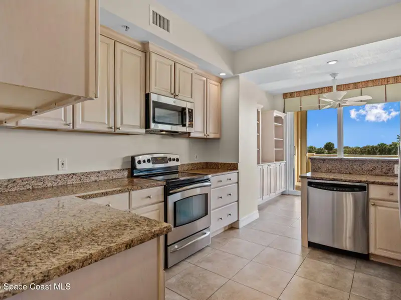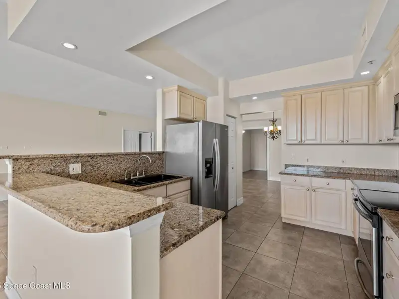 - Kitchen with granite counters and stainless appliances