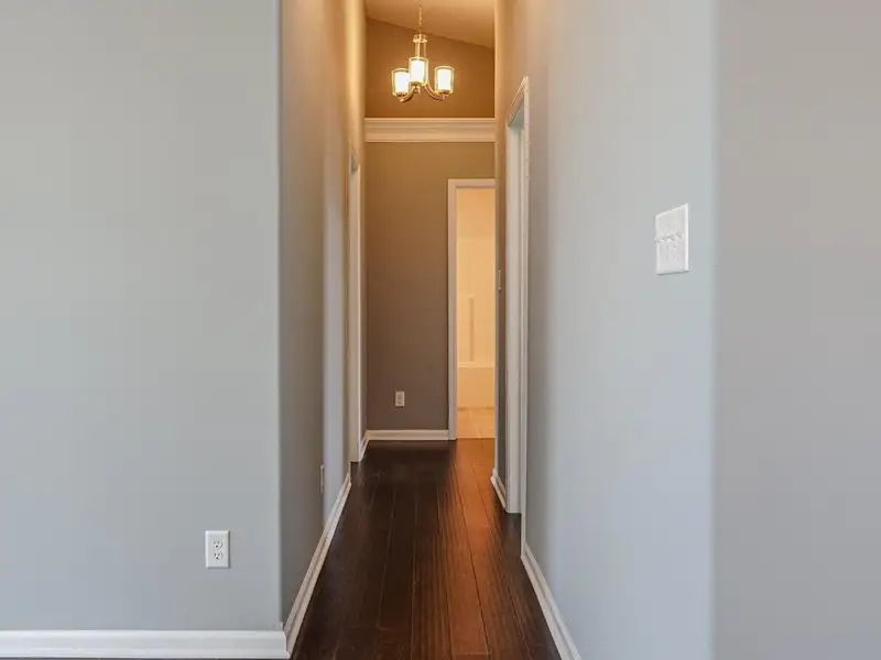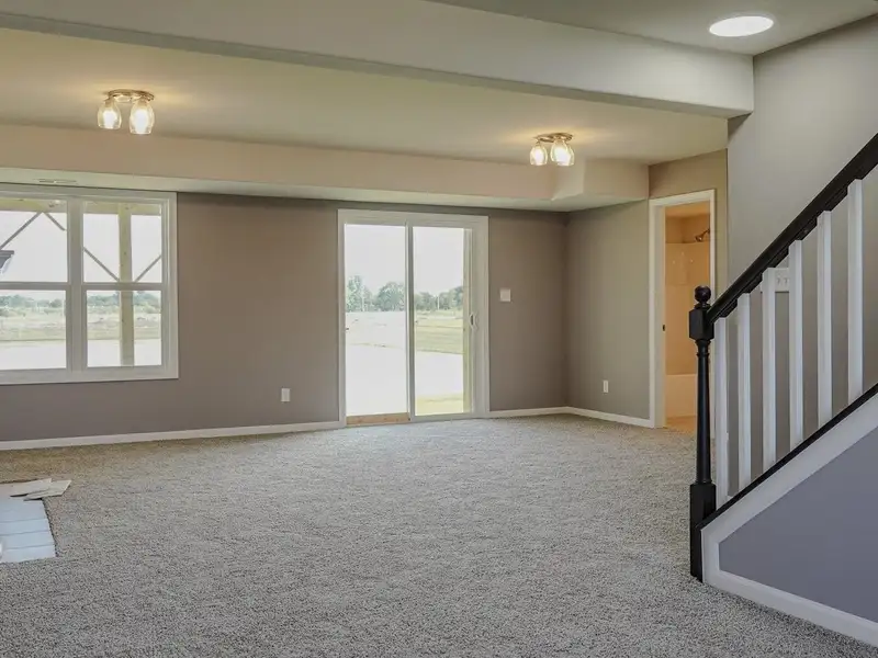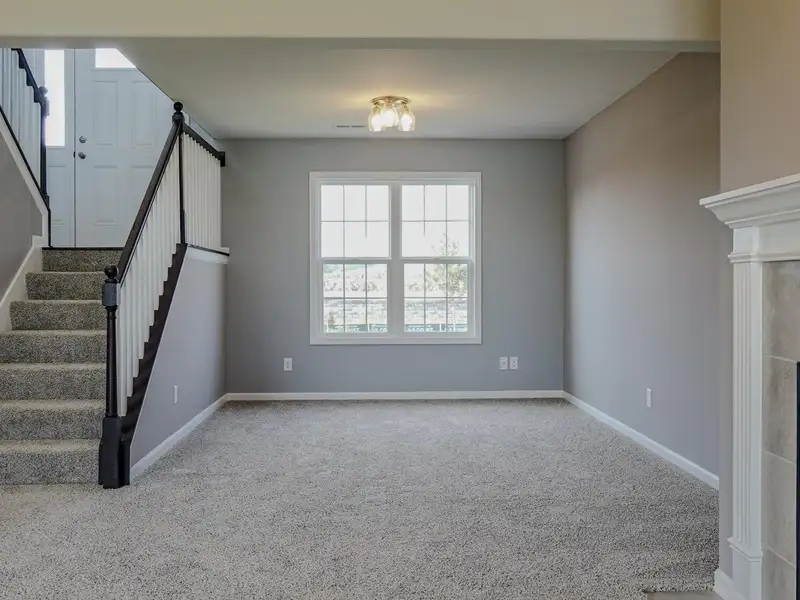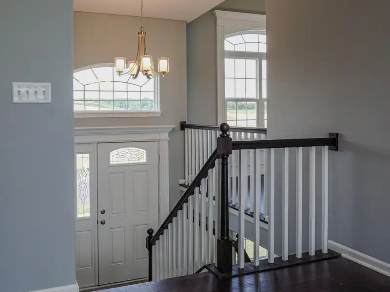 - Two-story foyer with oak railings