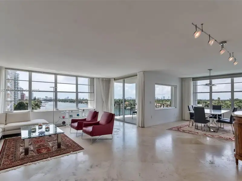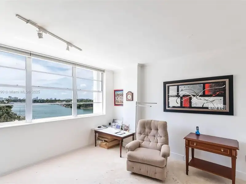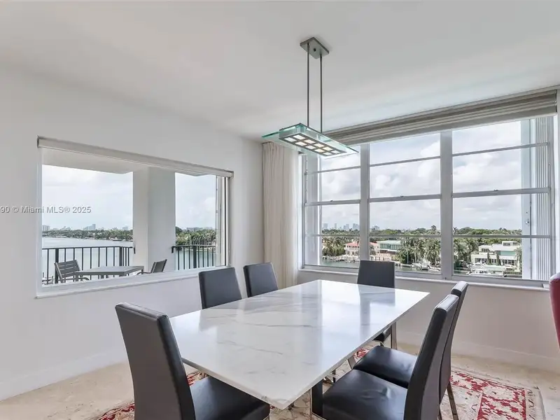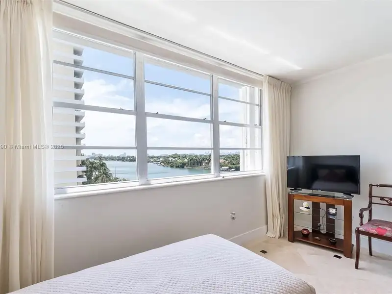 - Large windows and balcony with water views