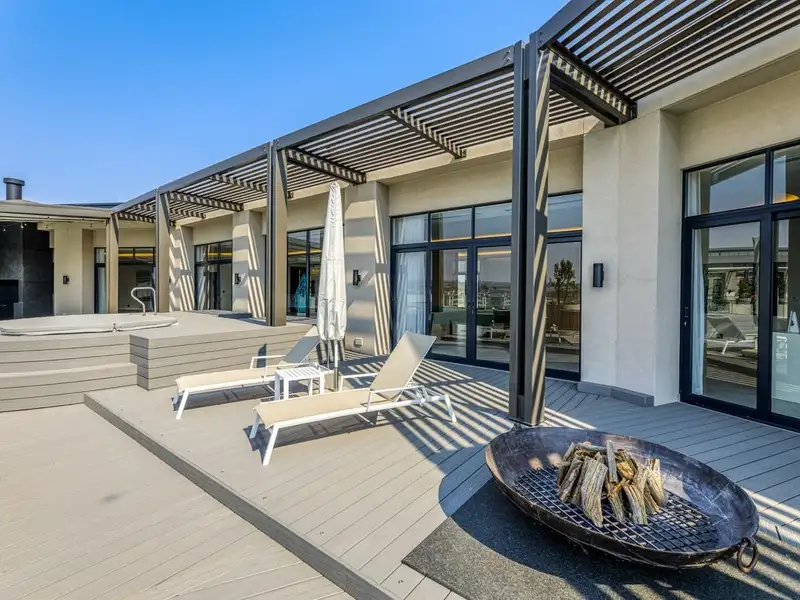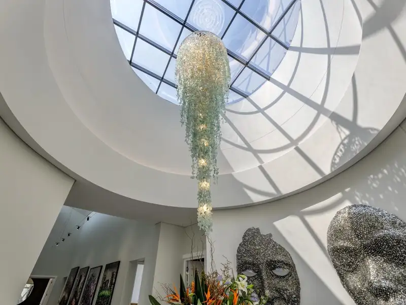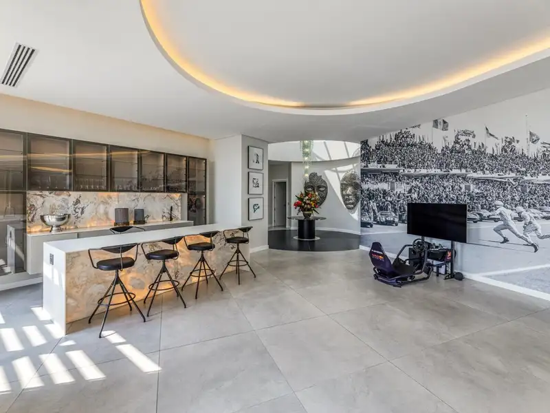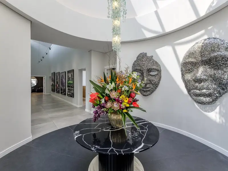 Designed for effortless entertaining and ultimate relaxation, the home features both formal and informal lounge and dining areas, as well as inside and outside bars ΓÇö perfect for hosting guests or enjoying quiet evenings in style. Stephen Pikus chandeliers and original artworks by Ramrutha Makoba add bespoke artistic flair, elevating the space with character and elegance.
