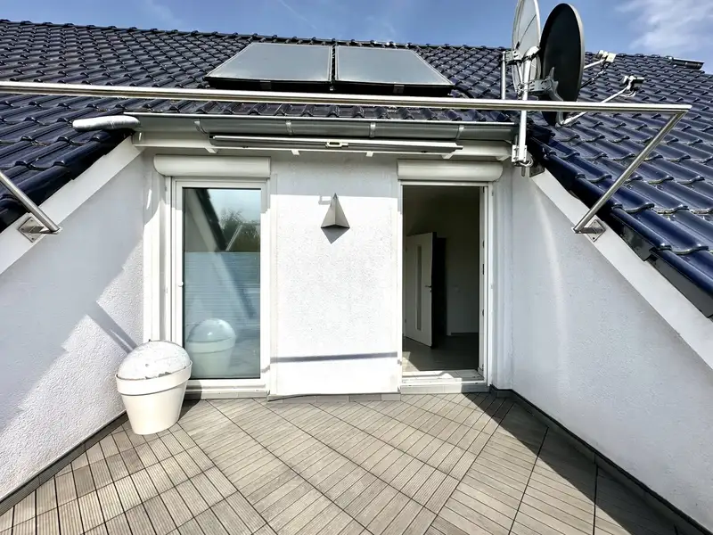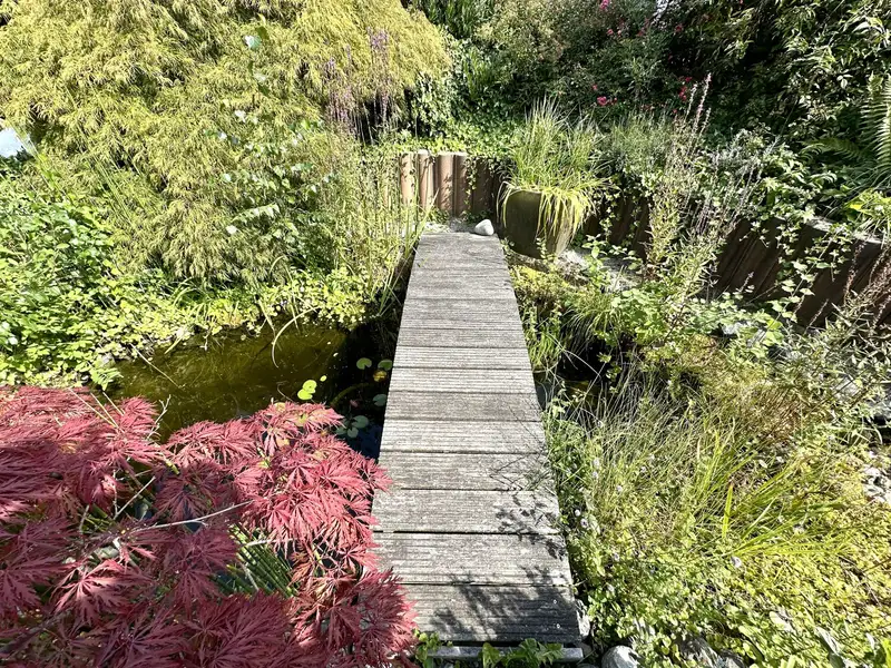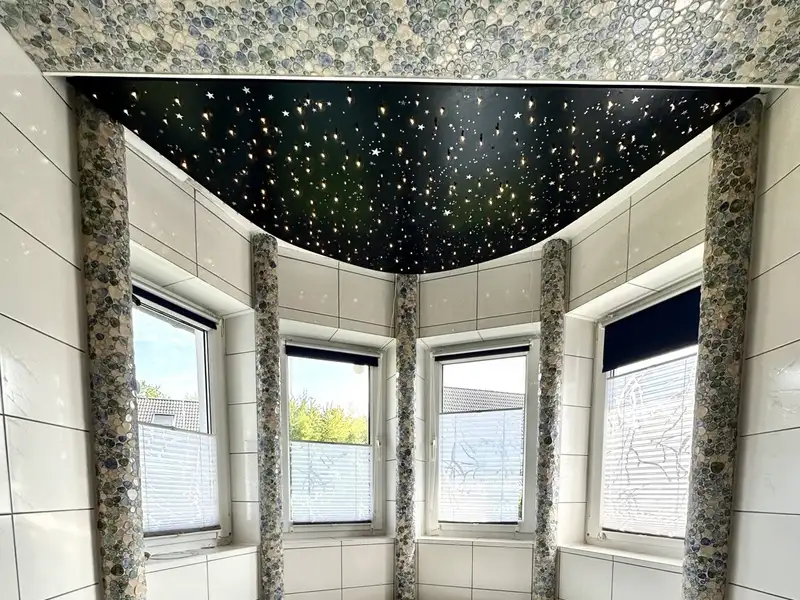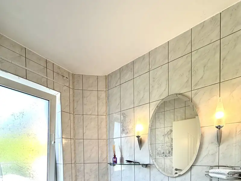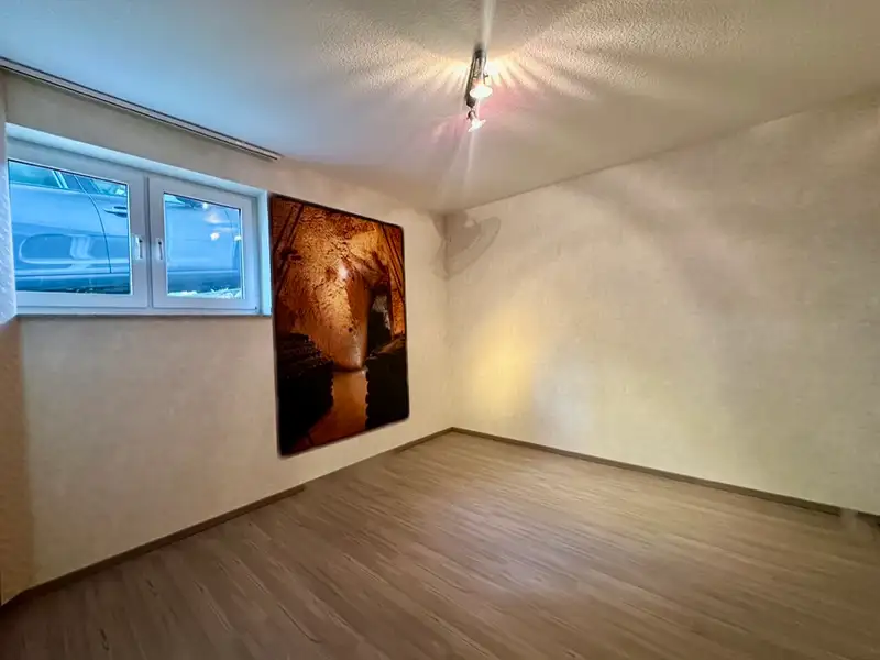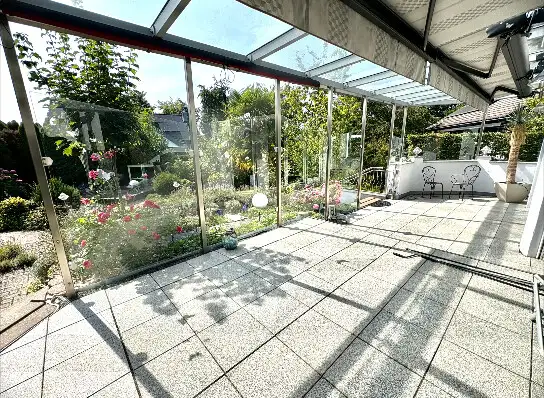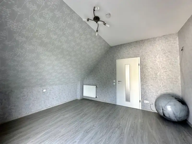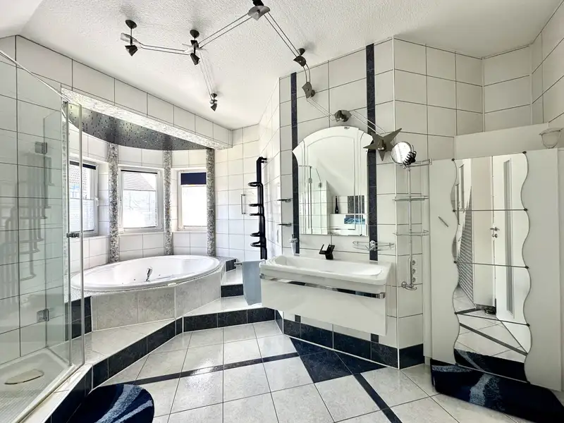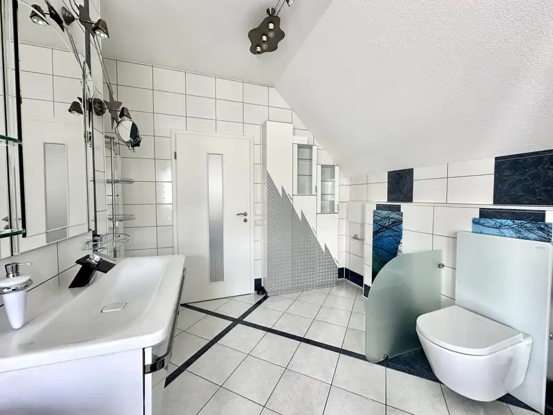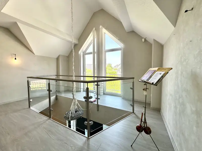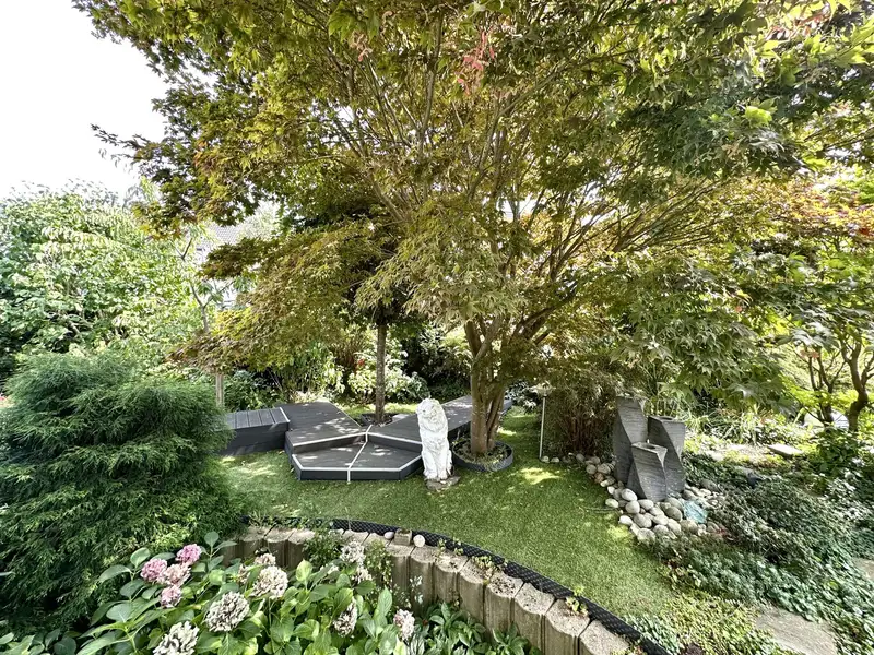 From the living area, you have direct access to the spacious, covered terrace, which is equipped with a walk-on safety glass roof. So you can enjoy your time out in the open whatever the weather. The lovingly designed garden impresses with a well thought-out concept: an automatic irrigation system, fed by a cistern for rainwater storage, ensures lush greenery, while the garden pond with koi fish is both a special feature and a place of tranquillity. There are three spacious bedrooms on the upper floor, which can be used in a variety of ways - as children's rooms, study rooms or guest rooms. All rooms are bright, friendly and create a private, quiet retreat for the whole family. The spacious bathroom, which is also located on this floor, is particularly noteworthy. A luxurious whirlpool bath awaits you here, promising relaxation at the touch of a button. An integrated LED starry sky creates an atmospheric ambience, transforming the bathroom into a real wellness experience - perfect for quiet evenings and relaxing downtime.