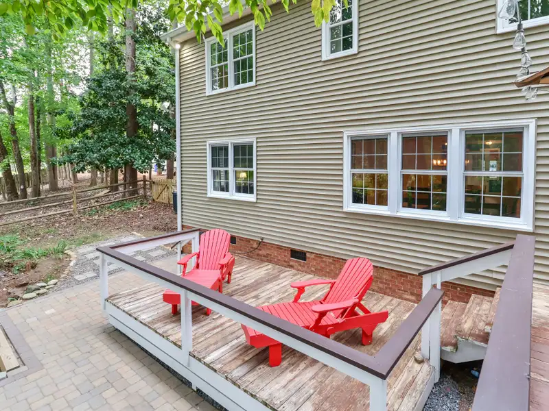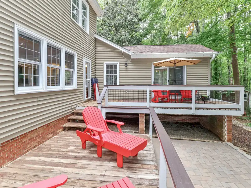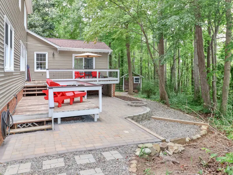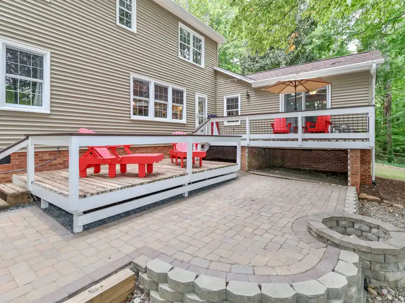 - Two-tiered wood deck with fire pit