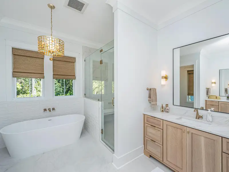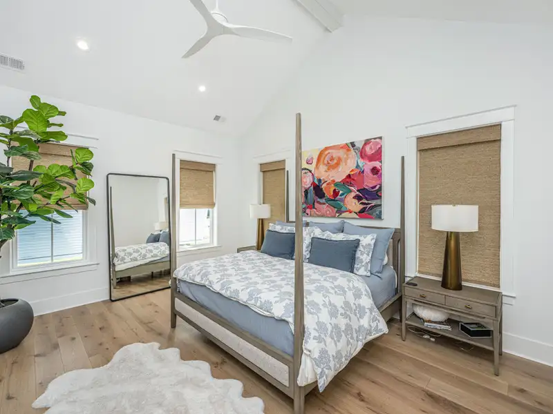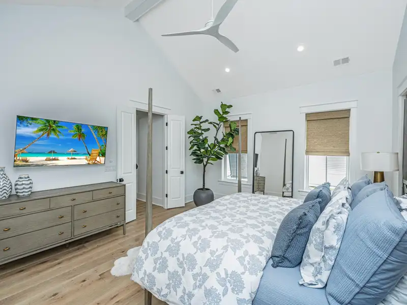 The primary suite is conveniently located on the main floor. It features a dramatic vaulted ceiling, his and her closets leading to a spa-like bath with a freestanding soaking tub, oversized walk-in shower, dual vanities, and private water closet.