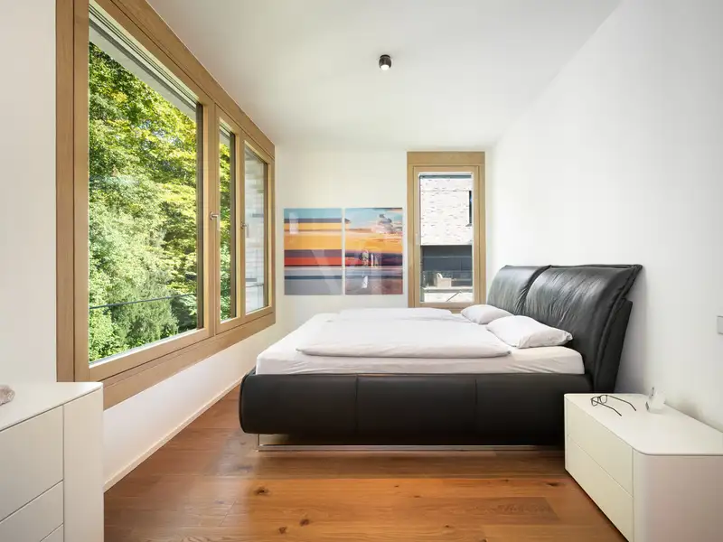 The private area is designed as a retreat - quiet and elegant. The master bedroom opens up via a walk-in dressing room to the adjoining master bathroom with Domovari double washbasin, built-in bathtub and floor-level rain shower. Fine surfaces, soft lighting and balanced proportions create an atmosphere of serenity and comfort.