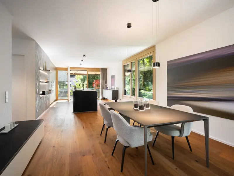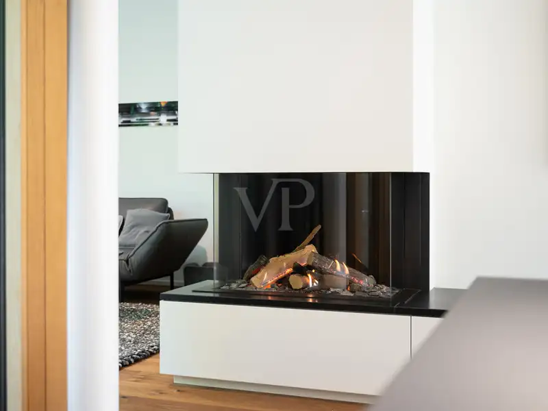 The kitchen opens seamlessly into the dining and living area. Generosity is palpable here - open, clear and with a natural lightness. The three-sided Calfire gas fireplace separates the dining area from the living area and forms a peaceful focal point. Generous glass surfaces bring light and nature into the interior, while wood-aluminum windows emphasize the combination of naturalness and precision.