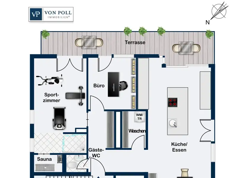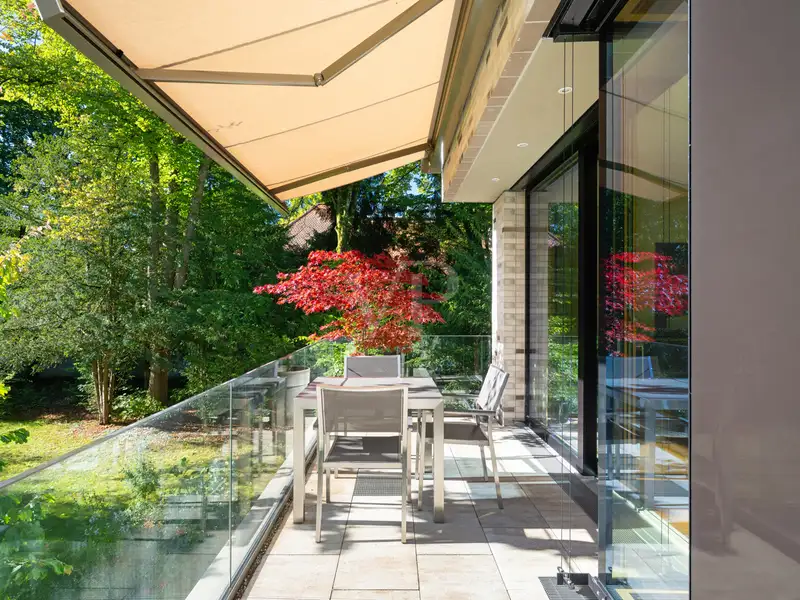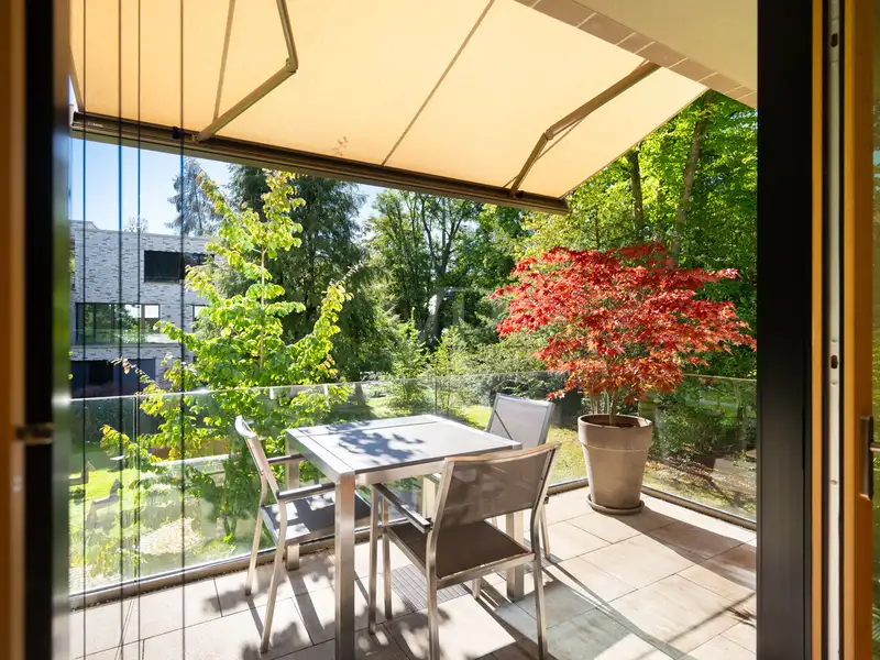 A guest WC and a functional utility room with connections for a washing machine and tumble dryer complete the space on offer. Electric awnings on the terraces provide pleasant shade and extend the living space outdoors onto the two east- and south-facing terraces.
