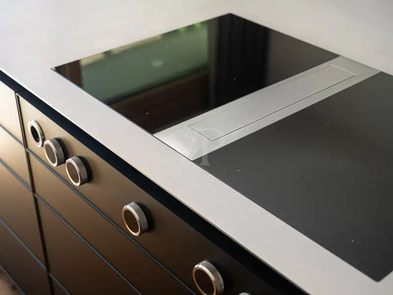 The Poggenpohl kitchen is more than just a functional room: it is the heart of this apartment - an architectural statement and meeting point at the same time. Stainless steel, glass and light merge into a harmonious whole. Appliances from Gaggenau, Bora and Miele, complemented by the Quooker system, meet the highest standards of technology and convenience.