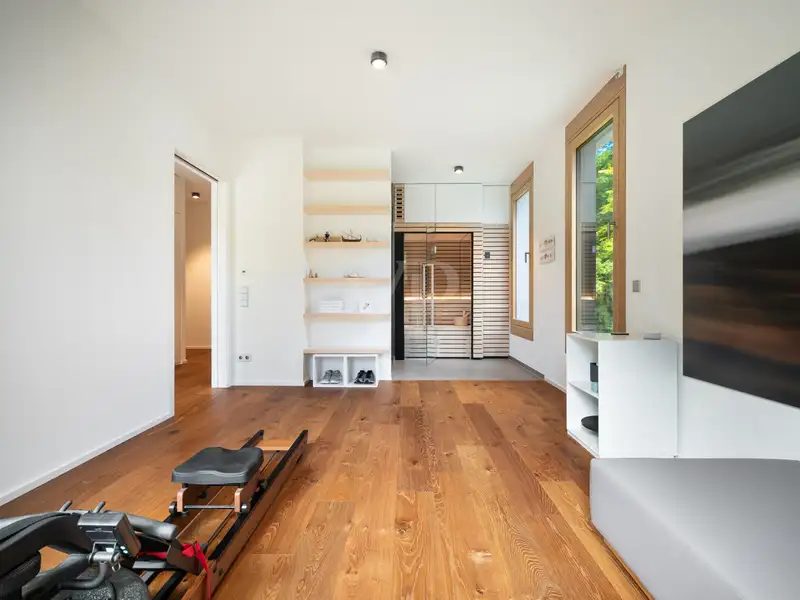 The third room is currently designed as a personal retreat for sport and regeneration. A floor-to-ceiling shower and the exclusive Finnish sauna made of spruce with infrared heaters and lighting create a private wellness zone that appeals to body and mind.