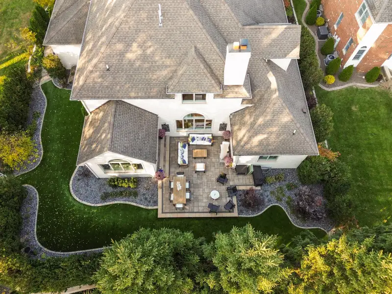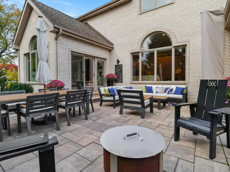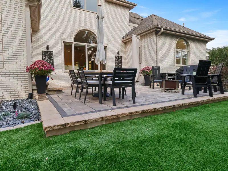 - Fenced backyard with stone patio