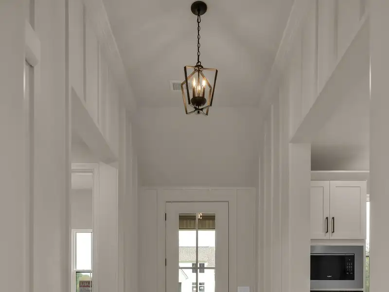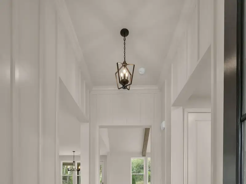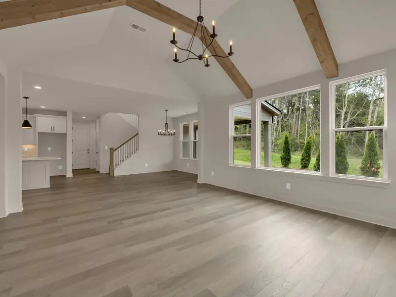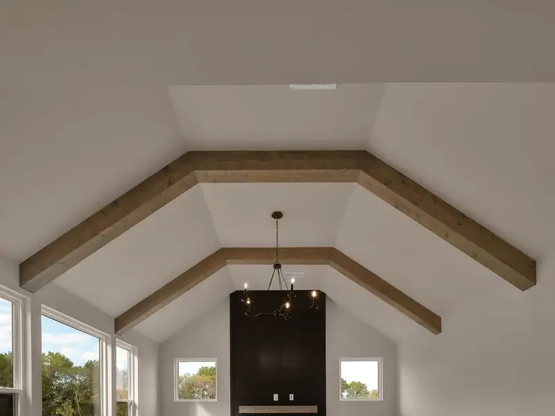 - Vaulted ceiling with wood beams