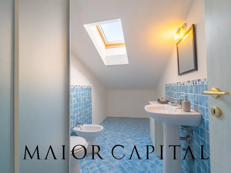 The sleeping area on the first level consists of a double bedroom and a bathroom with a window. Going up to the upper floor, which has a sloping ceiling, there are currently two further double bedrooms, both equipped with Velux windows that guarantee optimal natural lighting and a striking view of the sky. The sleeping area is completed by a second bathroom with a window, convenient and functional for guests or family.