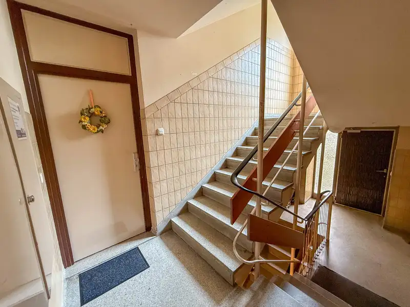The apartment is located on the 1st floor on the right (apartment number 4) of a well-kept apartment building from 1957. The building comprises a total of eight units that share a stairwell, with two apartments per floor. There are also communal parking spaces available on the property.