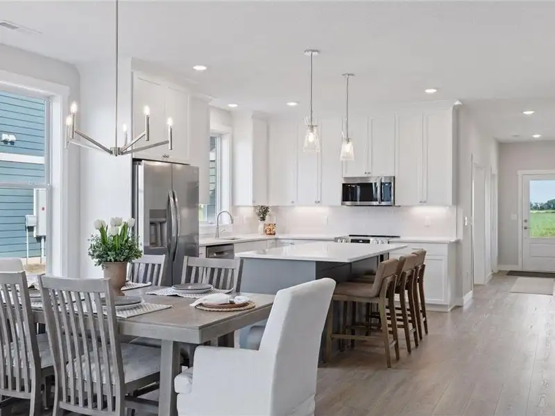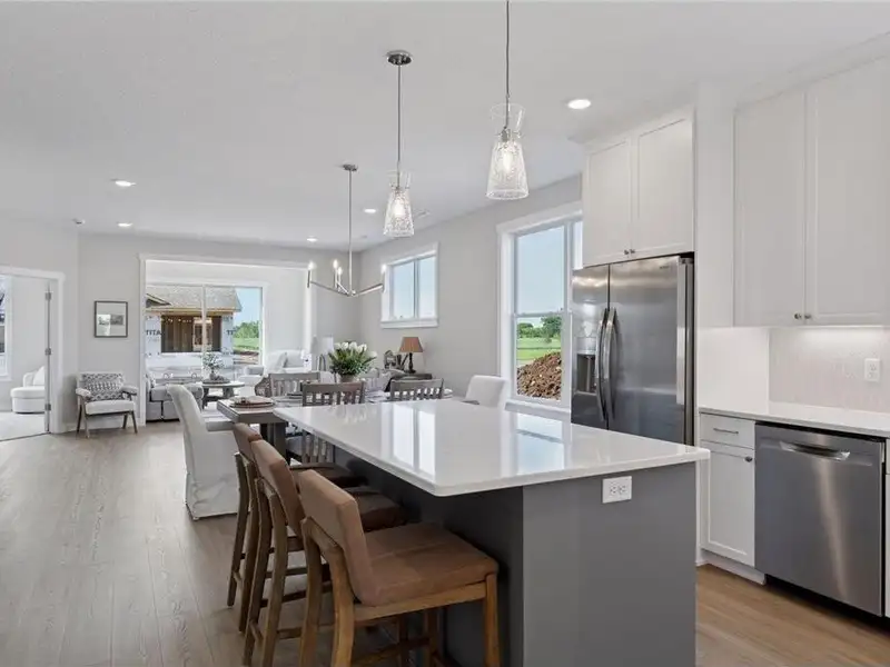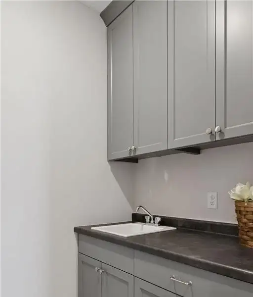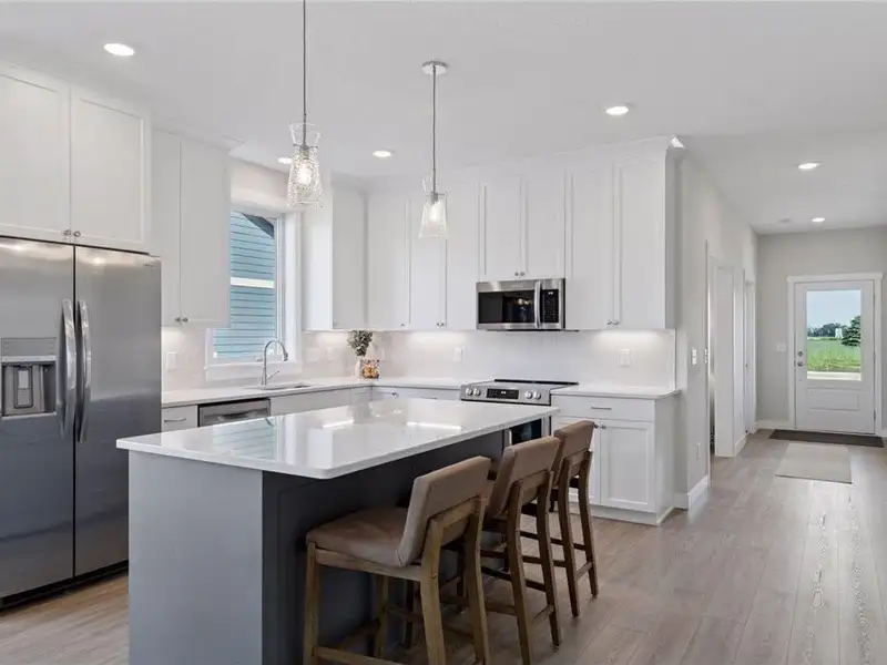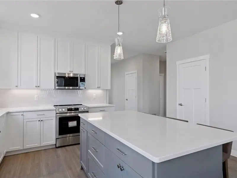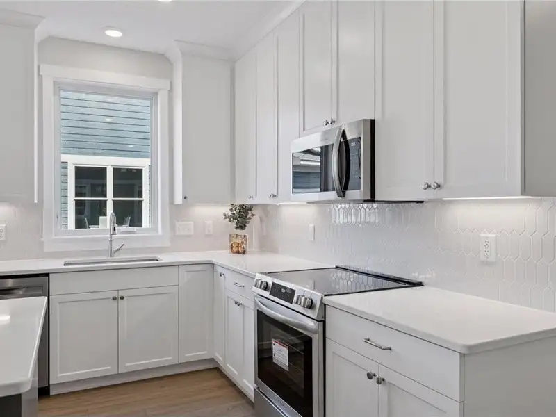 - Quartz countertops and tile backsplash