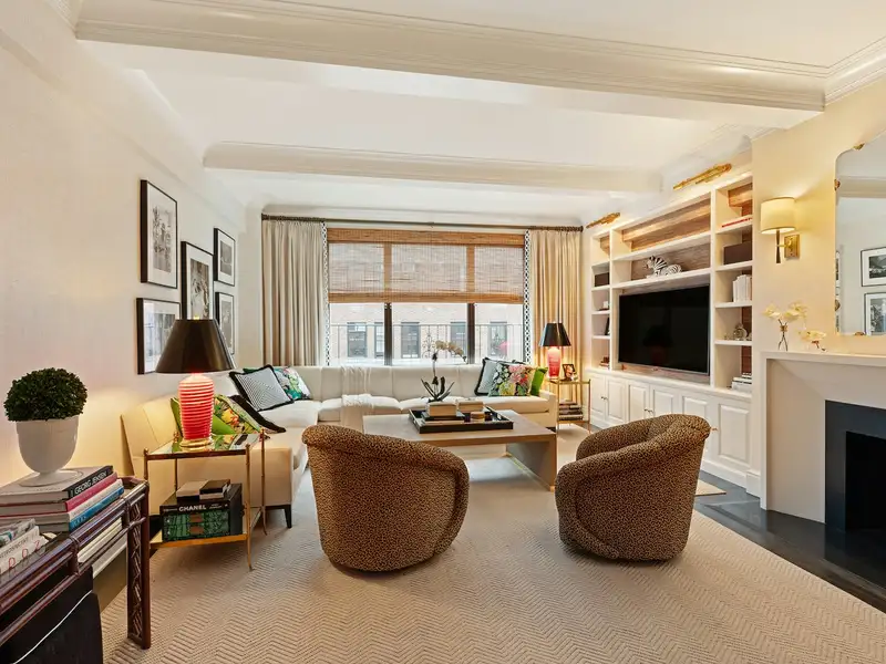 - Sun-drenched living room with marble fireplace
