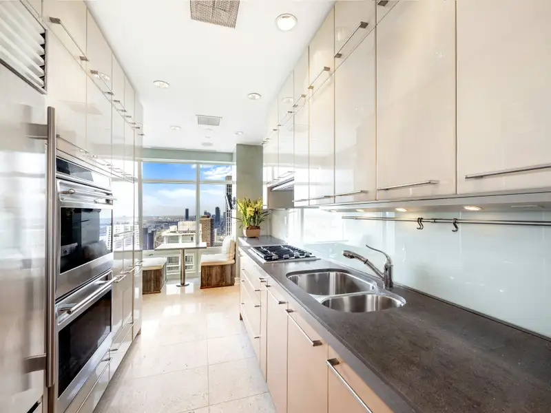 The Poggenpohl-designed chef's kitchen is equally impressive, featuring a windowed breakfast nook with commanding city and East River views. Finishes include Basaltina stone countertops, Pannafragola granite flooring, sleek cabinetry, dry wine storage, and top-tier appliances by Wolf, Sub-Zero, and Miele.