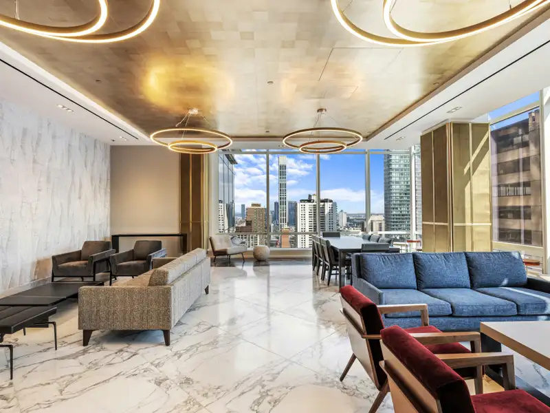 The Beacon Club, exclusively for residents, occupies the 29th floor and offers panoramic views alongside exceptional amenities: a state-of-the-art fitness center with massage rooms, an entertainment suite with catering kitchen, a playroom, and a high-tech business lounge.