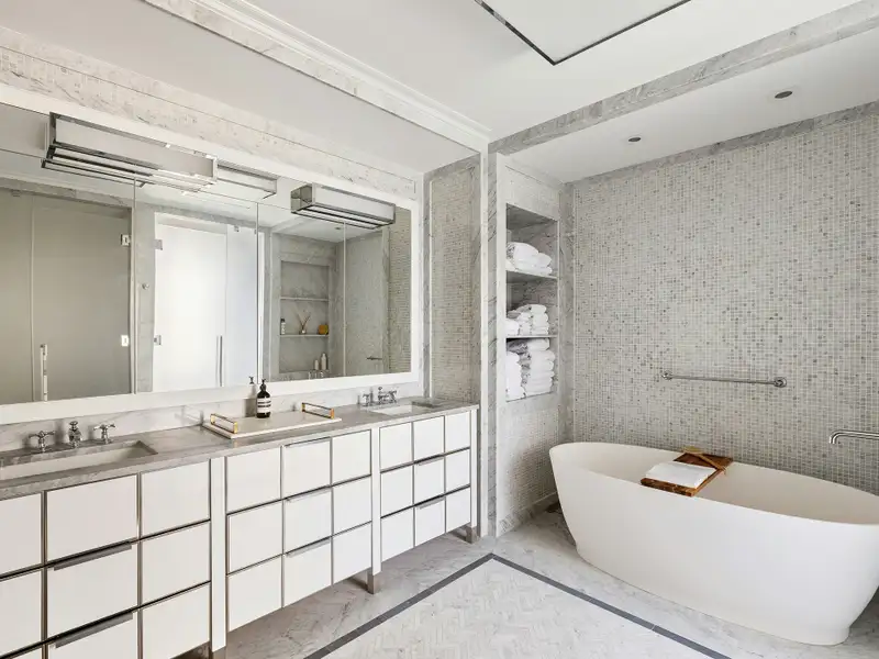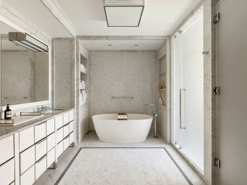 While each bedroom is complete with an en suite bathroom, huge closets, oversized windows and ample privacy, the Primary Bedroom Suite enjoys an exquisite fireplace mantle, huge walk-in-closet and an additional windowed "bonus room". The bonus room can serve as a home office, nursery, dressing room, or even a second walk-in closet! The spa-like bathroom has generous proportions with an oversized soaking tub, double sinks and vanities, a huge windowed shower stall, separate toilet booth, and Italianate mosaic marble tile surfaces. Finished in a soothing color palate of light blues, greys, and white, the primary bathroom offers a serene oasis.