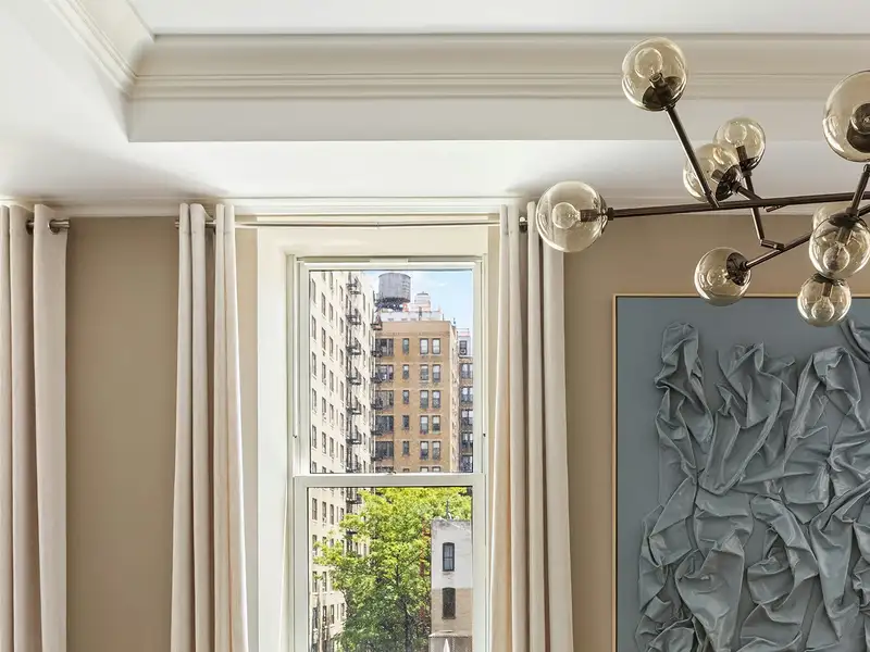 Brilliantly sunny and facing East from the living room, the primary view is both colorful and serene. Oversized windows look out over green trees and assorted building backyards of varying shapes and sizes, nestled between West 71st-West 72nd, with a peek of high-rise buildings and blue skies in the distance.