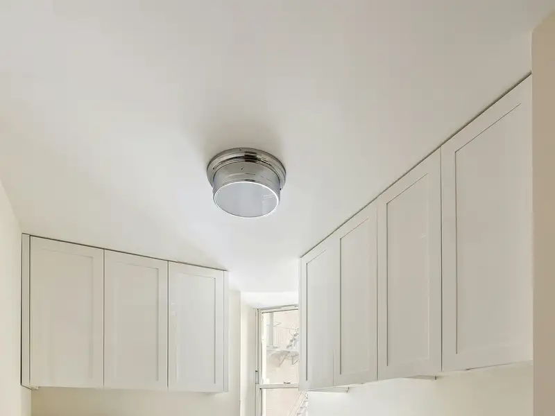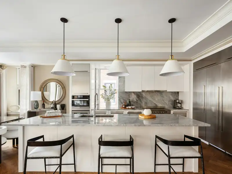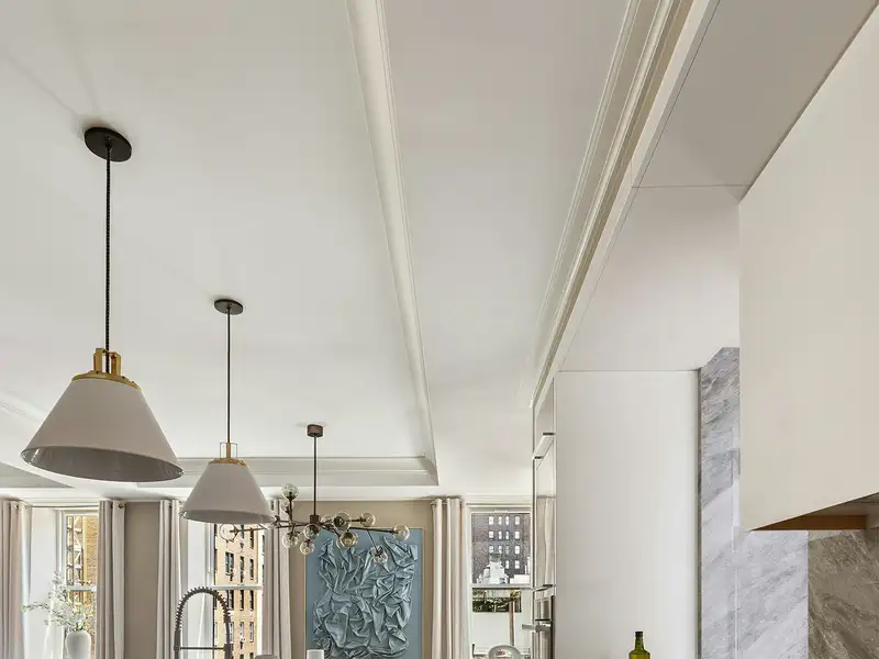 Servicing the square 25-Foot Wide "Great Room", with regal beamed ceilings and paneling, is the open eat-in-kitchen that would inspire the most discerning chef. Barstools line up along the expansive overhang of the quartzite island, while custom-built, lacquered kitchen cabinets provide an abundance of storage. The Verona induction range vents externally, and an added Miele Convection/Microwave wall oven provides additional high-speed cooking/heating options. The Miele Dishwasher is disguised with beautiful cabinet paneling, and a side-by-side Gaggenau Refrigerator/Freezer offers very spacious storage, and there is also a separate wine fridge. This luxurious kitchen is part of an open, loft-like space (nearly 600 sq. feet) that includes the formal dining area and living room. Additional bells and whistles of the residence include: Solid 5" white oak hardwood floors laid in a handsome herringbone pattern, central air conditioning, and a separate windowed laundry/"Mud" room with a Bosch washer and dryer (a welcome and rare bonus!)