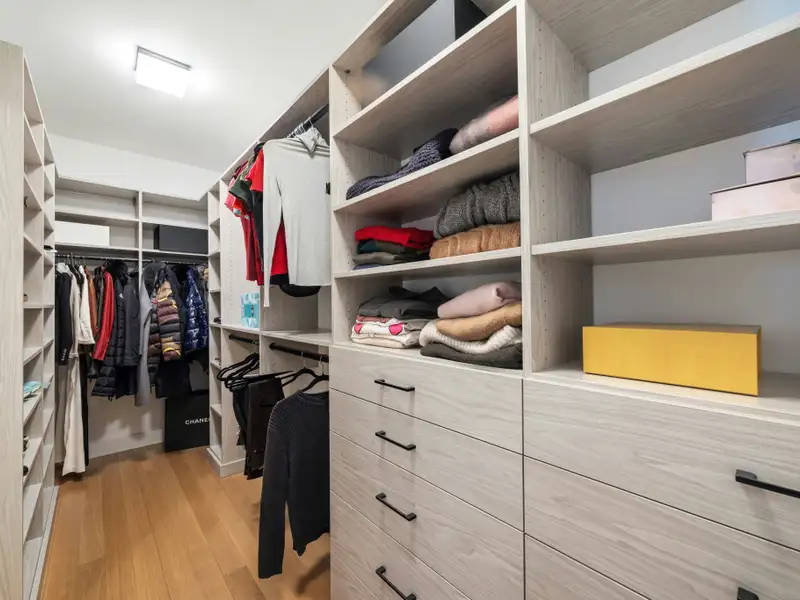 The two large walk-in closets, outfitted by California Closets, are the perfect complement to this perfect primary suite. There are two additional bedrooms each with an en-suite bath, electronic blackout shades and custom drapery. Each of the bedroom closets feature newly installed "soft close" sliding doors to maximize the bedroom spaces. There is also a marble powder room, custom oak flooring throughout, along with a full sized laundry center with additional storage.