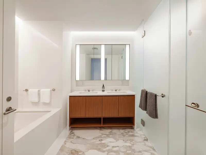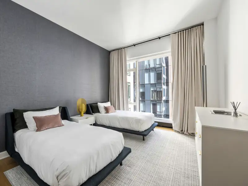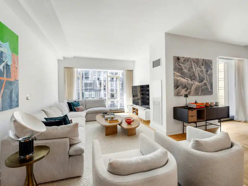Enter into a grand oversized foyer, featuring custom wallpaper and lighting, leading you to the open living space. You are immediately greeted by floor to ceiling southern facing windows illuminating both the living and dining rooms. The large living room is the perfect gathering place to watch your favorite show or entertain friends. Open to the living room is a dining room perfect for hosting great dinner parties or just a casual dinner after work. This open living space is anchored by an enormous open kitchen with a huge marble island. The kitchen features a suite of Gaggenau appliances, including 3 wall ovens, gas cooktop, warming drawer, integrated refrigerator/freezer, dishwasher and don't forget the wine cooler too. The marble countertops and glass backsplash showcase the high-end finishes of this kitchen and complement the beautiful custom oak cabinetry. The apartment has an ultra-private primary suite with floor to ceiling windows both with electronic blackout shades and custom drapery. There is a five-piece primary marble bath with heated flooring.