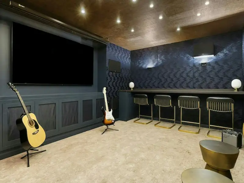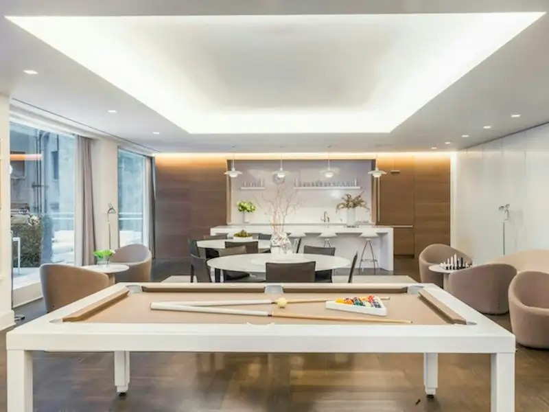 Amenities include a large and elegant lounge with a Billiard table and outdoor space; a rooftop terrace with fireside seating and grill; a windowed fitness center designed by The Wright Fit; a fun-filled playroom created by Silver Hill Atelier; a multimedia music room; a conference room with remote meeting capabilities; and private tutoring/study pods.