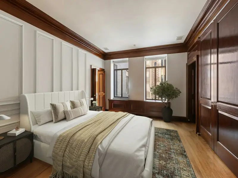 The luxurious primary bedroom suite is a serene retreat, featuring abundant natural southern light and sweeping river views, along with a private dressing room and en-suite bath. Three additional generously sized bedrooms, one with its own en-suite bathroom, and two sharing a Jack and Jill bathroom, provide ample space and privacy. In addition, the apartment includes two staff rooms and baths, as well as a powder room located just off the foyer. A large eat-in kitchen is accompanied by a butler's pantry. There is also a full laundry room off of the staff rooms.
