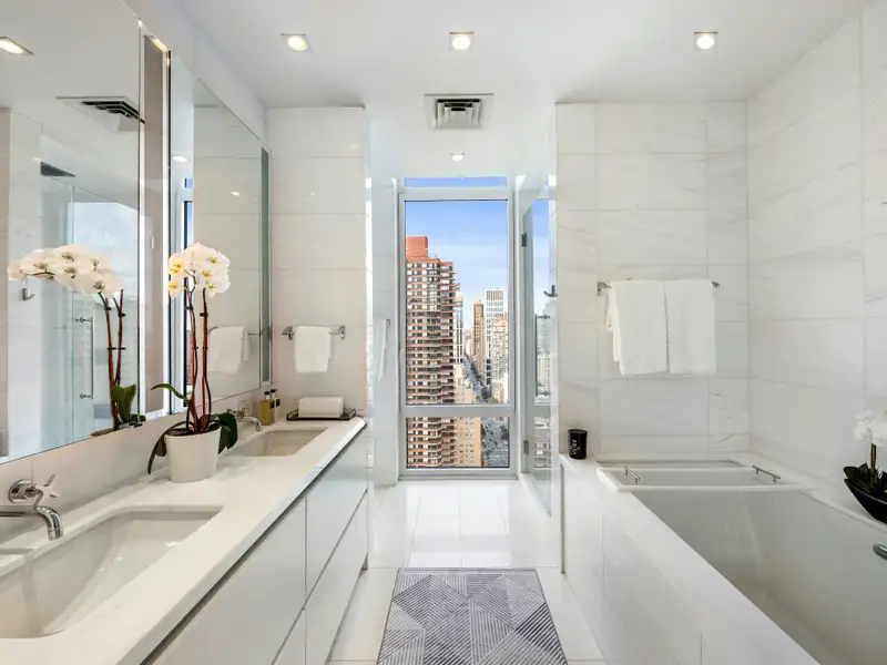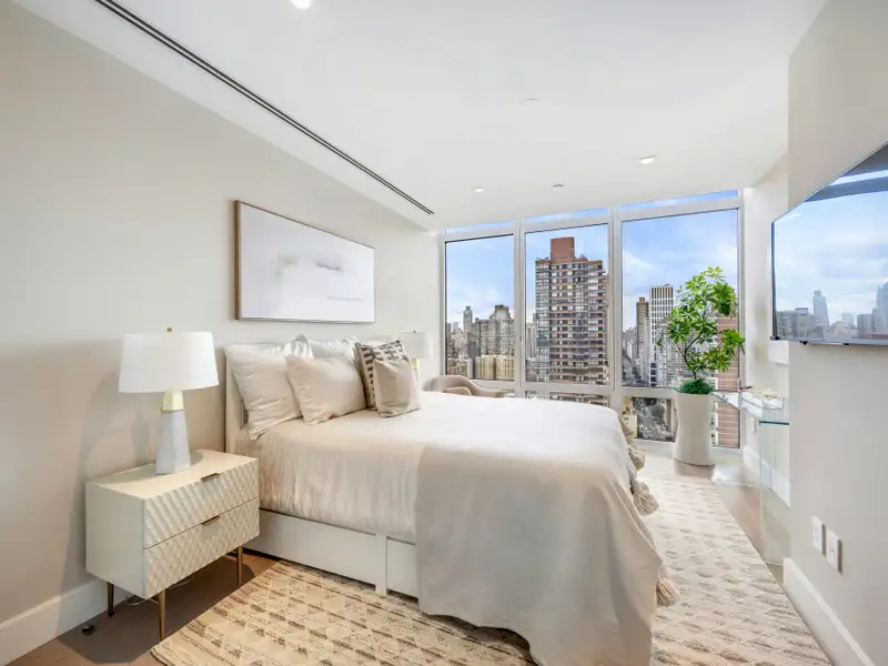 The primary suite is a serene private retreat, capturing endless skyline vistas through walls of glass. The exquisite windowed spa bathroom, clad in Bianco Dolomiti marble, features dual vanities, a soaking tub, and a glass-enclosed stall shower. Storage is abundant, featuring a custom walk-in closet alongside a meticulously outfitted hallway suite to meet the most exacting standards.