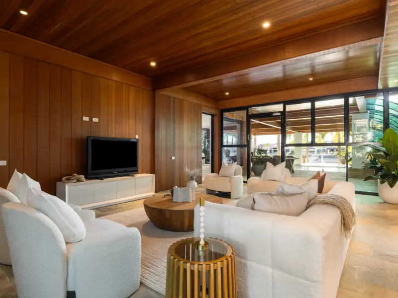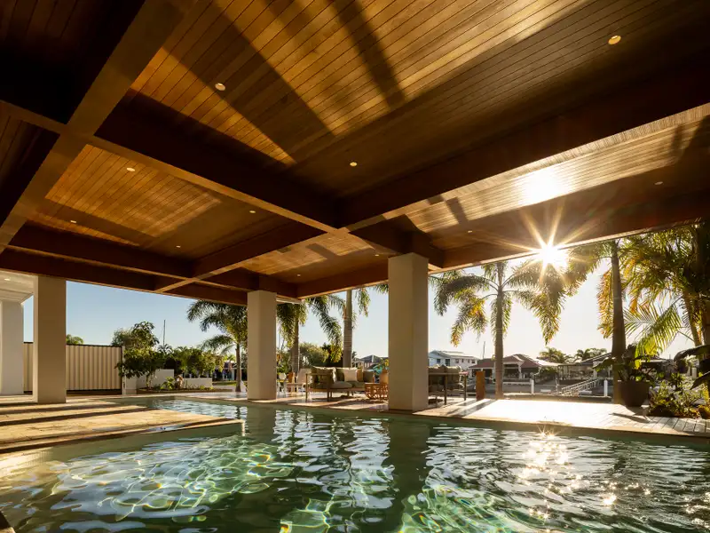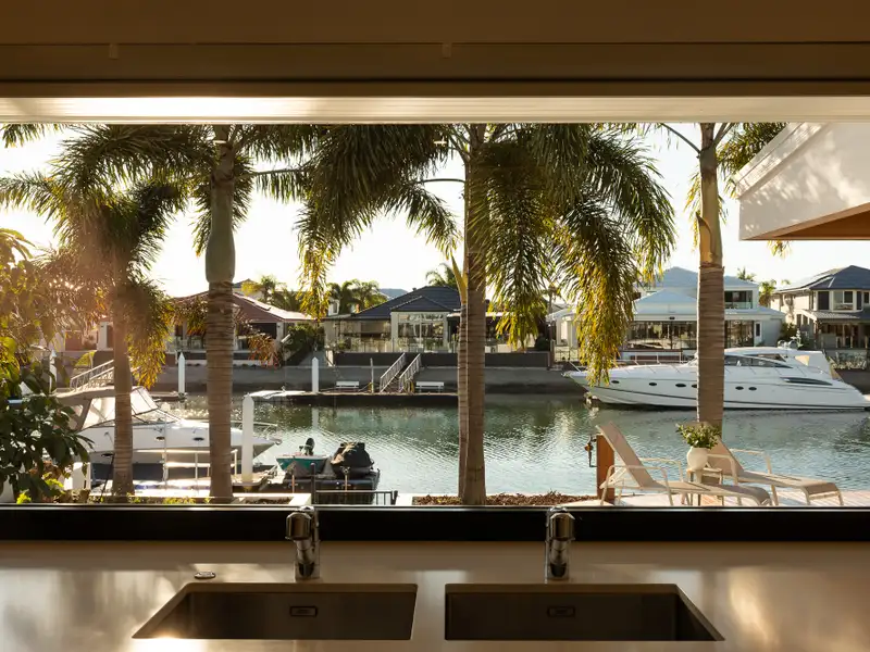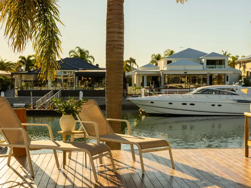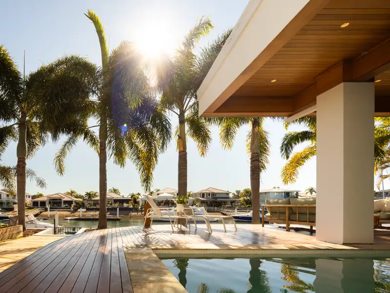 - Incredible resort-inspired outdoor entertaining including hardwood decking, mature palms, waterside sun deck and large built-in BBQ