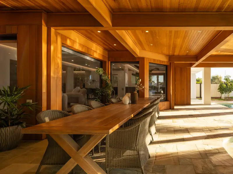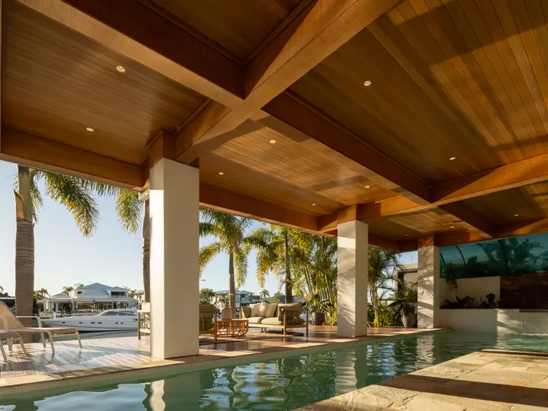 Elite design continues outside where high-end finishes, timber detailing and that water backdrop ensure you'll feel like you're in a five star resort. The sparkling in-ground swimming pool offers lap swimming and is semi-protected from the elements whilst beautiful decked surrounds, mature palms and stylish tiling provide the ideal setting for dining and lounging. Adorned with a built-in BBQ kitchen and waterfall feature, you can choose to entertain under the expansive timber-lined ceiling or enjoy waterside drinks on the sun-kissed deck!