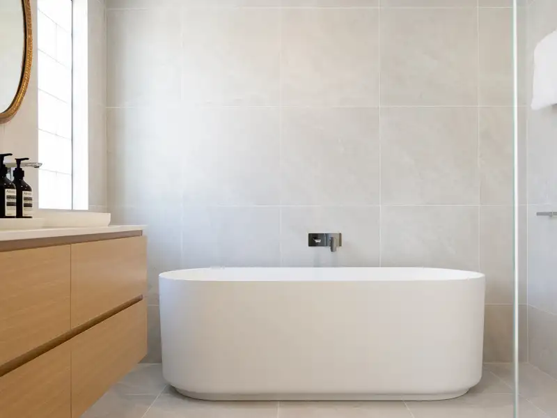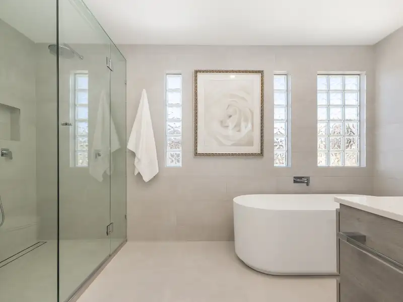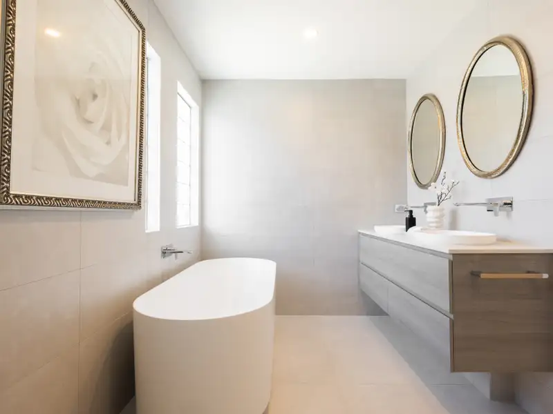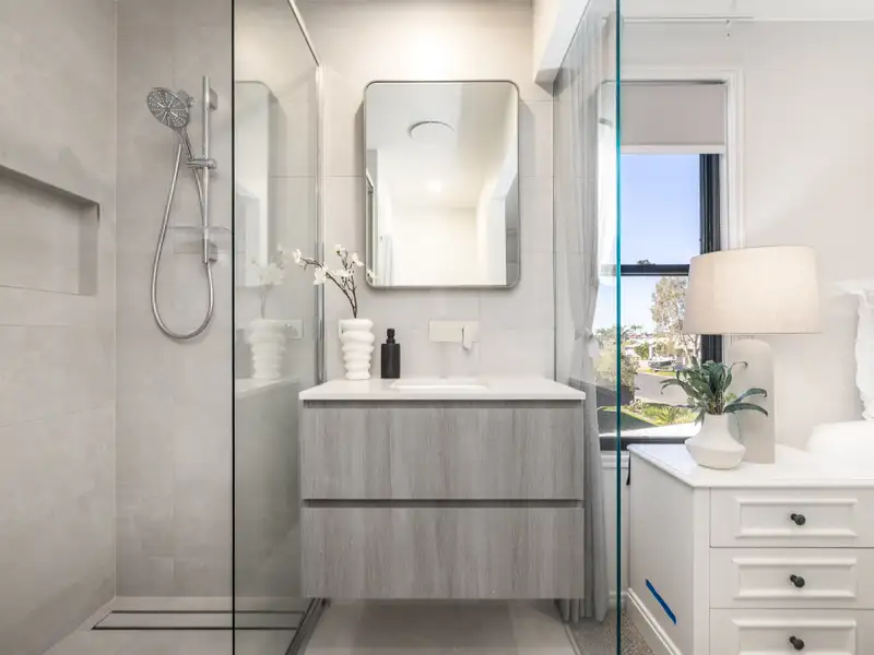 - Private master retreat with waterside balcony, walk-in robe, and luxurious ensuite with freestanding matte wave bath, custom shower screen and dual vanity